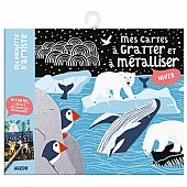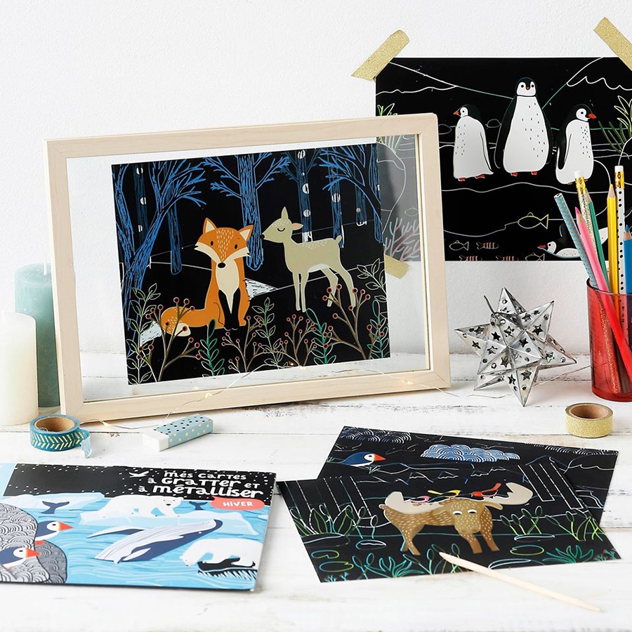 Νιφάδες χιονιού, χιονισμένα χωριά…Ανακάλυψε τη μαγεία του χειμώνα ξύνοντας τις 10 κάρτες και χρησιμοποιώντας τα χαρτιά μεταλλιζέ για να τα διακοσμήσετε. Αφαιρέστε την ταινία χρησιμοποιώντας το ειδικό μολύβι και τοποθετήστε τα μεταλλιζέ φύλλα στα σημεία με κόλλα, ξύνοντας τα ώστε να κολλήσουν καλά και οι φανταστικές εικόνες είναι έτοιμες!