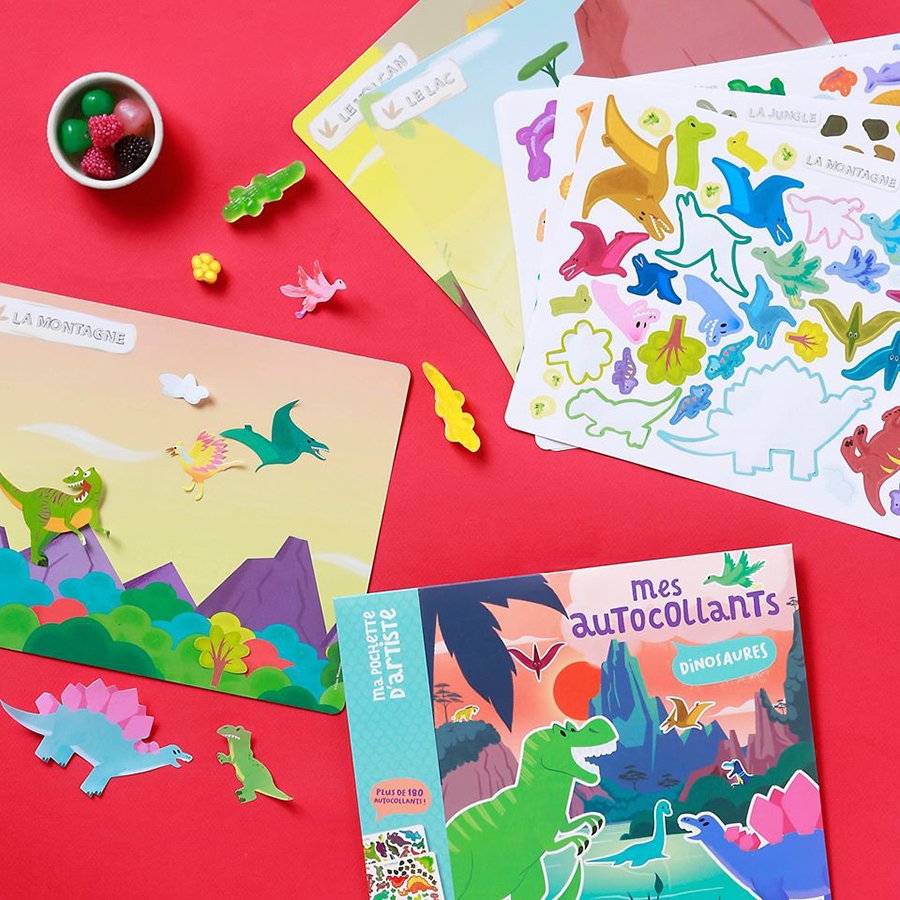 Χρησιμοποιήστε τα διάφορα αυτοκόλλητα όπως τον τυραννόσαυρο, τον βραχιόσαυρο ή τον τρικεράτοπα και διασκεδάστε τοποθετώντας τους στη ζούγκλα, κοντά στο ηφαίστειο αλλά και στη θάλασσα!