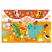 Ανακαλύψτε τα ζώα που ζουν στη ζούγκλα με αυτό το μικρό παιχνίδι παζλ. Φτιάξε ένα παζλ με 24 κομμάτια και 4 τρισδιάστατες φιγούρες άγριων ζώων, αποτελούμενες από 5 κομμάτια η καθεμία