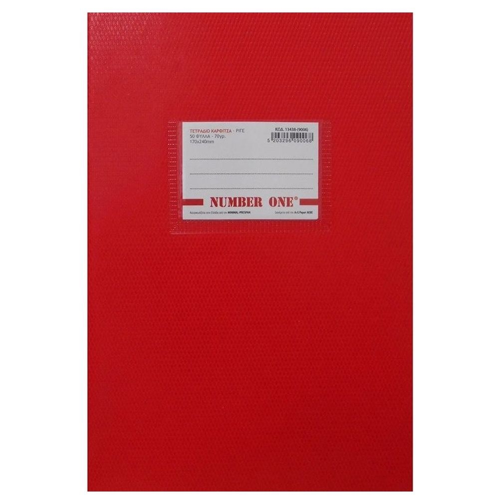 Τετράδιο Number One, 70 γραμμαρίων, κόκκινο, με 50 ριγέ φύλλα. Διαθέτει πλαστικό εξώφυλλο υψηλής αντοχής που παραπέμπει σε ύφασμα και ετικέτα σε θήκη.