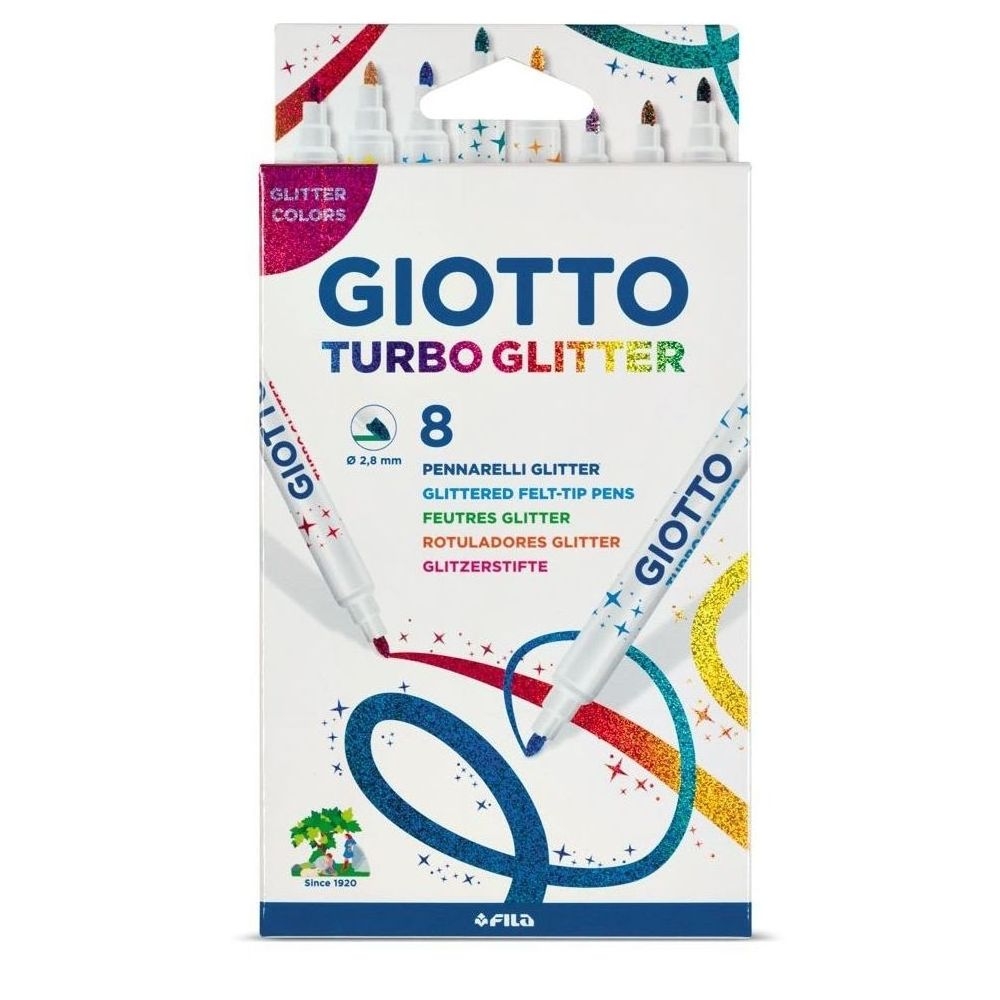 Μαρκαδόροι giotto turbo με ειδικό μελάνι glitter σε 8 διαφορετικά χρώματα. Οι Giotto Turbo Glitter μαρκαδόροι είναι ιδανικοί στο να δημιουργούν σχέδια. Πρακτικοί, διασκεδαστικοί και με πρωτότυπες αποχρώσεις είναι ιδανικοί για διακόσμηση και ζωγραφική. Ξεπλένεται από τα υφάσματα στους 40°.