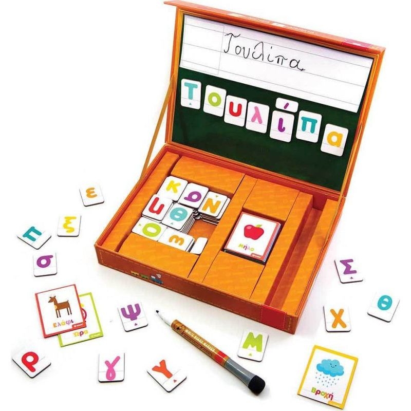 Περιλαμβάνει : 50 μαγνητικές κάρτες διπλής όψης, 24 κεφαλαία και 48 πεζά μαγνητικά γράμματα υψηλής ανθεκτικότητας, 7 τόνους, 1 μαγνητικό πίνακα με γραμμές, 1 μαρκαδόρο «γράψε – σβήσε» με σφουγγάρι.