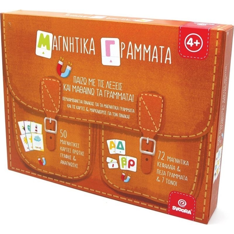 Μαγνητικό Σετ γραμμάτων και εικόνων από την ελληνική εταιρία Svoora. Τα παιδιά, με τις μαγνητικές κάρτες πρώτης γραφής και ανάγνωσης, αποκτούν την πρώτη επαφή τους με τα γράμματα της ελληνικής αλφαβήτου! Η ταύτιση της εικόνας με τη λέξη ενισχύει την κατανόηση των εννοιών και την αναγνώριση των πεζών και κεφαλαίων χαρακτήρων. Οι τόνοι βοηθούν στην εκμάθηση της ορθογραφίας και της ανάγνωσης. Ο πίνακας και τα γράμματα περιέχουν γραμμές που καθοδηγούν το παιδί στη σωστή γραφή πάνω σε αυτές. Ο πιο δημιουργικός τρόπος για την εξάσκηση της παρατηρητικότητας και το συντονισμό χεριού-ματιού.