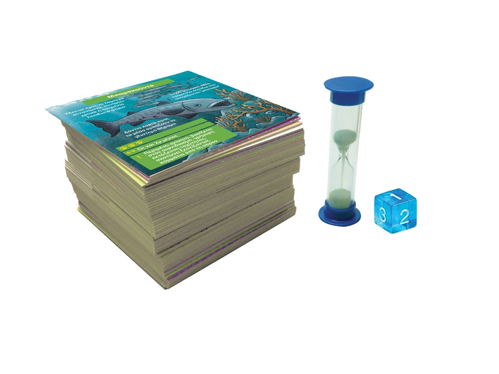 Περιλαμβάνει: 55 κάρτες , 1 Kάρτα με κανόνες ,1 Kλεψύδρα και 1 Ζάρι.