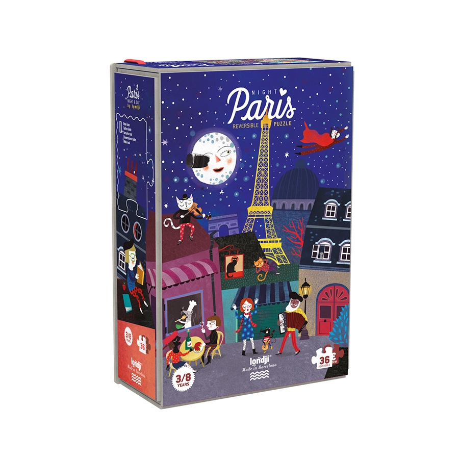 Ένα εξαιρετικό παζλ διπλής όψης, αποτελούμενο από 36 κομμάτια. Από τη μια πλευρά υπάρχει μια εικόνα που απεικονίζει τη ζωή στο Παρίσι τη μέρα. Από την άλλη πάλι η ίδια πόλη, αλλά αυτή τη φορά τη νύχτα. Είτε πρωί, όμως, είτε βράδυ, ο κόσμος διασκεδάζει στο Παρίσι! Υψηλή ποιότητας χαρτόνι.