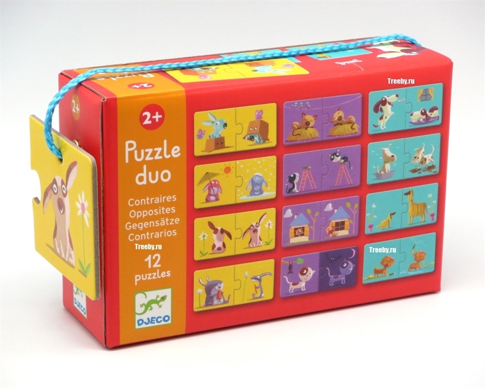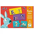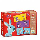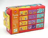 Παζλ από την σειρά Puzzle Duo της εταιρείας Djeco, που αποτελείται από 24 κομμάτια με τα οποία μπορούν να δημιουργηθούν 12 παζλ των 2 κομματιών. Τα παιδιά πρέπει να παρατηρήσουν τα διαθέσιμα κομμάτια και να τα συνδυάσουν. Ένα νοηματικό παζλ που καλλιεργεί τη συγκέντρωση, την υπομονή και την παρατηρητικότητα των παιδιών και αναπτύσσει τον συντονισμό χεριού – ματιού τους.