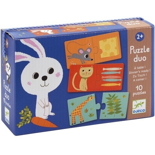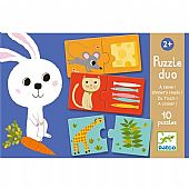 Παζλ από την σειρά Puzzle Duo της εταιρείας Djeco, που αποτελείται από 20 κομμάτια με τα οποία μπορούν να δημιουργηθούν 10 παζλ των 2 κομματιών. Τα παιδιά πρέπει να παρατηρήσουν τα διαθέσιμα κομμάτια και να τα συνδυάσουν. Ένα νοηματικό παζλ που καλλιεργεί τη συγκέντρωση, την υπομονή και την παρατηρητικότητα των παιδιών και αναπτύσσει τον συντονισμό χεριού – ματιού τους.