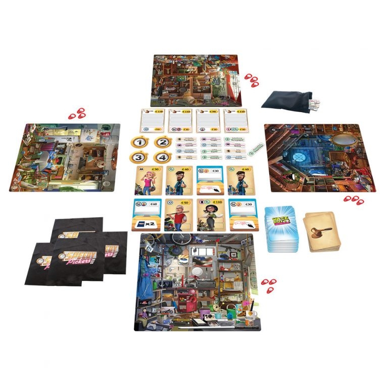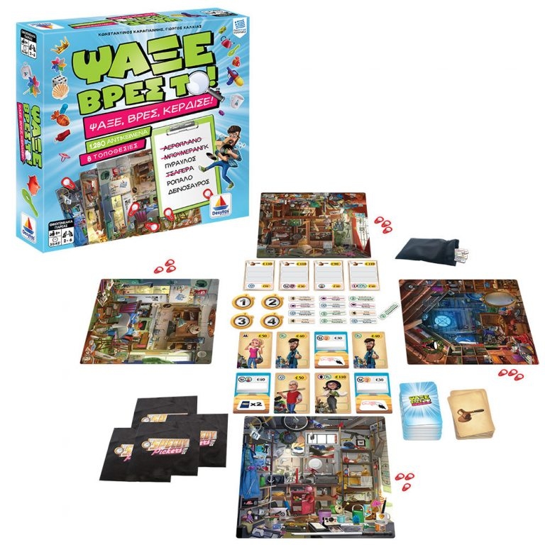 Περιλαμβάνει: 160 πλακίδια Αντικειμένων, 18 πλακίδια Ενεργειών, 100 κάρτες Πωλήσεων, 48 Κάρτες Συλλεκτών, 28 κάρτες Πωλήσεων στο ίντερνετ, 24 κάρτες Δημοπρασιών, 24 δείκτες «Το Βρήκα!», 6 δείκτες Σειράς Παικτών, 4 πανάκια, 8 ταμπλό Τοποθεσιών, 1 πουγκί.Τύπος παιχνιδιού: Οικογενειακό, παρέας, σκέψης, αντίληψης, ταχύτητας, παρατηρητικότητας.