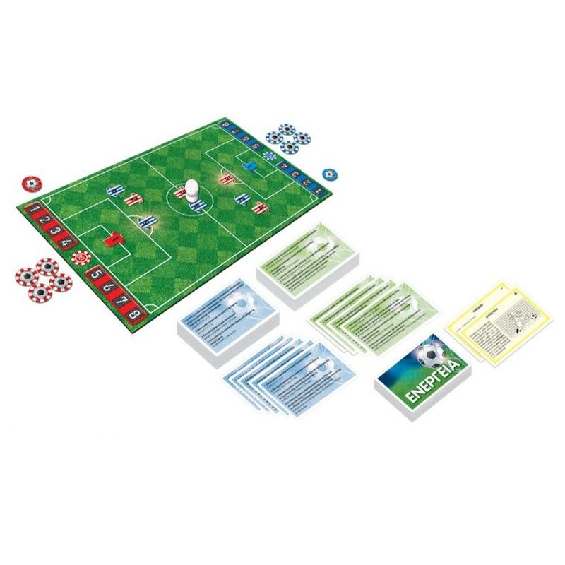 Περιλαμβάνονται: 1 ταμπλό-γήπεδο, 1 μπάλα, 50 κάρτες ενεργειών, 550 κάρτες ερωτήσεων, 8 μάρκες πονταρίσματος, 1 μάρκα νομίσματος, 1 μάρκα πλεονεκτήματος, 2 μάρκες γκολ, οδηγίες.