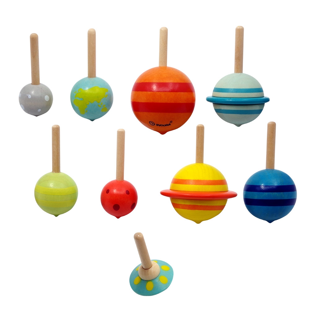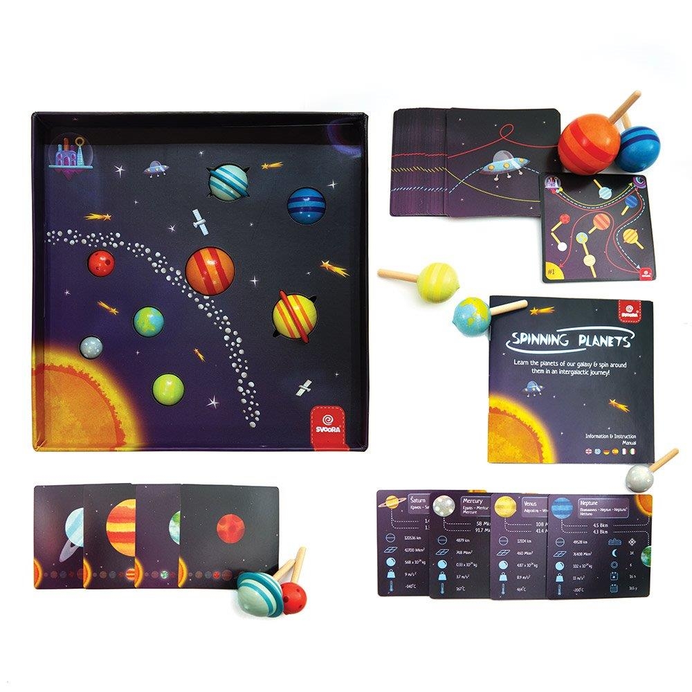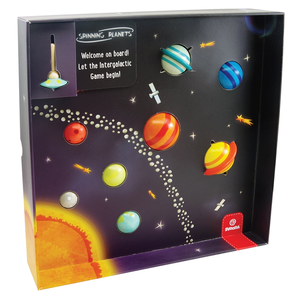 Επιτραπέζιο παιχνίδι με σβούρες για την εκμάθηση του ηλιακού μας συστήματος και την εξάσκηση της λεπτής κινητικότητας. Προσφέρει πολλαπλούς τρόπους παιξίματος και εκπαιδευτικά οφέλη, ανάλογα με την ηλικία των παιδιών. Διαθέτει κάρτες πληροφοριών, οι οποίες όχι μόνο εισάγουν αλλά και εξοικειώνουν τα παιδιά με το πλανητικό μας σύστημα. Παράλληλα, οι 8 σβούρες – πλανήτες σε διαφορετικό μέγεθος και χρώμα η καθεμία, αποτελούν το τέλειο «εργαλείο» εξάσκησης των κινητικών δεξιοτήτων των παιδιών, μέσω της περιστροφής τους. Επιπλέον, το παιχνίδι διαθέτει κάρτες έτοιμων αποστολών με διαδρομές, τις οποίες καλούνται τα παιδιά να διασχίσουν περιστρέφοντας τη σβούρα - διαστημόπλοιο και να φτάσουν τελικά στον προορισμό τους. Με αυτό τον τρόπο βελτιώνουν τη λεπτή κινητικότητα και τη χωρική αντίληψη, αποκτώντας τελικά αυτοπεποίθηση όταν τα καταφέρνουν. Εκτός αυτού, τα παιδιά έχουν τη δυνατότητα να σχεδιάσουν και τις δικές τους αποστολές, αναπτύσσοντας τη δημιουργικότητά τους. Ένα υπέροχο εκπαιδευτικό παιχνίδι, που θα χαρίσει ατέλειωτες ώρες διασκέδασης και δημιουργικής απασχόλησης.