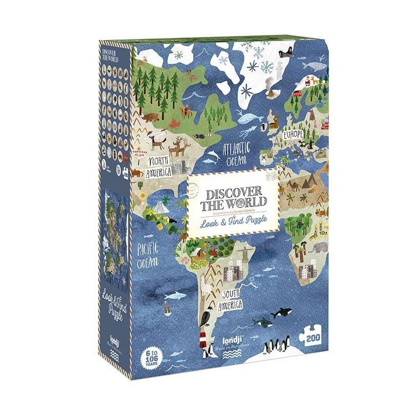Το παζλ 200 κομματιών της Londji "Ανακαλύψτε τον Κόσμο" εγγυάται ατελείωτες ώρες διασκέδασης. Η συσκευασία περιλαμβάνει 34 μικρές κάρτες με μνημεία και ζώα, τις οποίες πρέπει να εντοπίσετε μέσα στην εικόνα του παζλ. Εκπαιδευτικό παιχνίδι που θα βοηθήσει τα παιδιά πρωτοσχολικής ηλικίας να ανακαλύψουν πληροφορίες για τον κόσμο που ζούμε. Κατασκευασμένο από 100% ανακυκλωμένα υλικά και σχεδιασμένο στην Βαρκελώνη από την ισπανική εταιρία Londji.