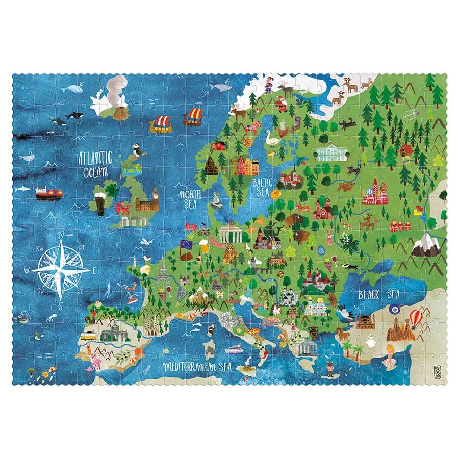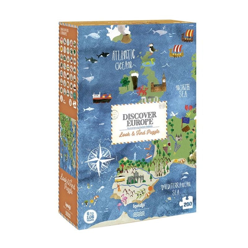 Η Ευρώπη είναι γεμάτη μέρη να επισκεφθείς και αυτό το παζλ θα σας βοηθήσει να ανακαλύψετε κάποια από τα θαύματα που κρύβει η Γηραιά Ήπειρος. Πρώτα λύστε το παζλ και σχηματίστε το χάρτη, και μετά ψάξτε για τη Sagrada Familia, το Κολοσσαίο, το Μπιγκ Μπεν, τον Παρθενώνα, και πολλά άλλα. Μπορείτε να τα βρείτε όλα; Το παιχνίδι περιλαμβάνει ένα παζλ 200 κομματιών και 34 κομμάτια παρατηρητικότητας. Εικονογράφηση: Carmen Saldana. Κατασκευασμένο από 100% ανακυκλωμένα υλικά και σχεδιασμένο στην Βαρκελώνη από την ισπανική εταιρία Londji.