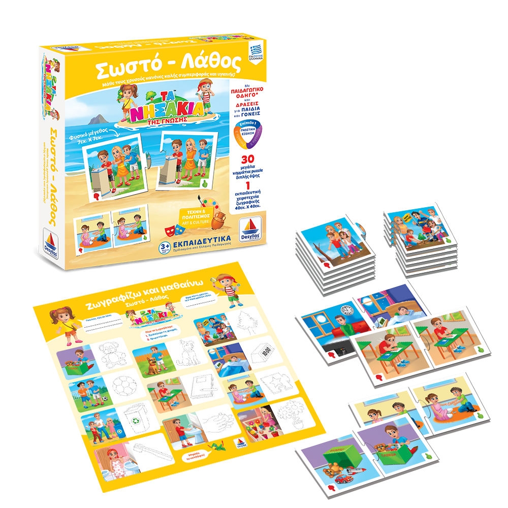 Περιλαμβάνει: 30 µεγάλα κοµµάτια puzzle διπλής όψης µε κανόνες καλής συµπεριφοράς, εκπαιδευτική χειροτεχνία ζωγραφικής, Παιδαγωγικός Οδηγός.