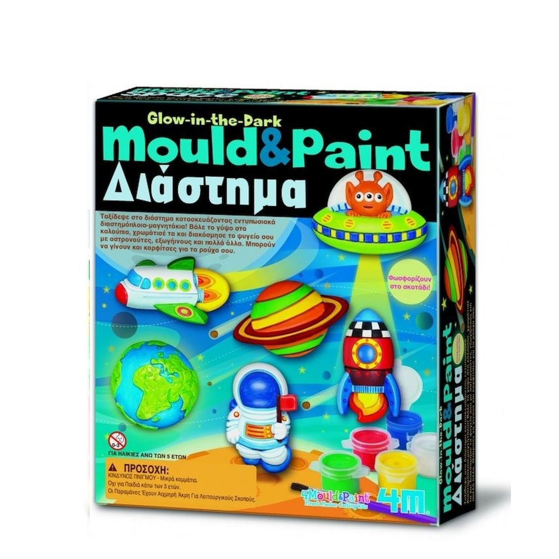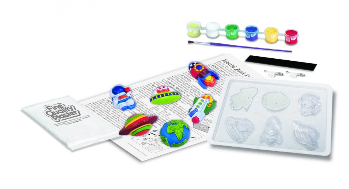 Ταξίδεψε στο διάστημα κατασκευάζοντας εντυπωσιακά διαστημόπλοια μαγνητάκια που φωσφορίζουν! Βάλε το γύψο στα καλούπια, χρωμάτισέ τα και διακόσμησε το ψυγείο σου με αστροναύτες, εξωγήινους και πολλά άλλα. Μπορούν να γίνουν και καρφίτσες για τα ρούχα σου.
