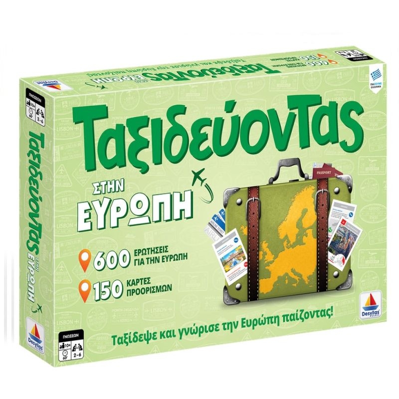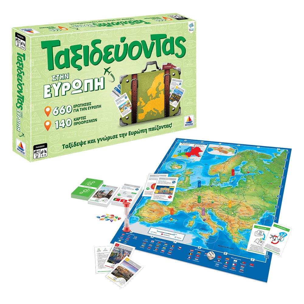 Περιλαμβάνει: 1 ταμπλό, 150 Κάρτες Προορισμών, 200 Κάρτες ερωτήσεων, 50 Κάρτες Ενεργειών, 18 Μάρκες, 6 πιόνια, 1 Κλεψύδρα 30”, 1 ζάρι και οδηγίες.Τύπος παιχνιδιού: Οικογενειακό, παρέας, γνώσεων, λύσης γρίφων.