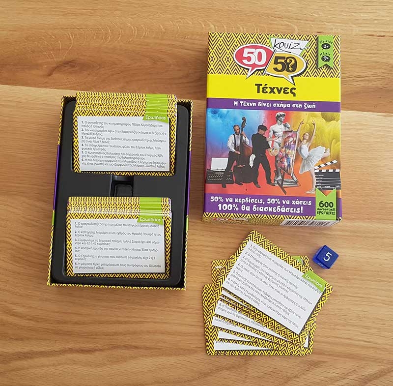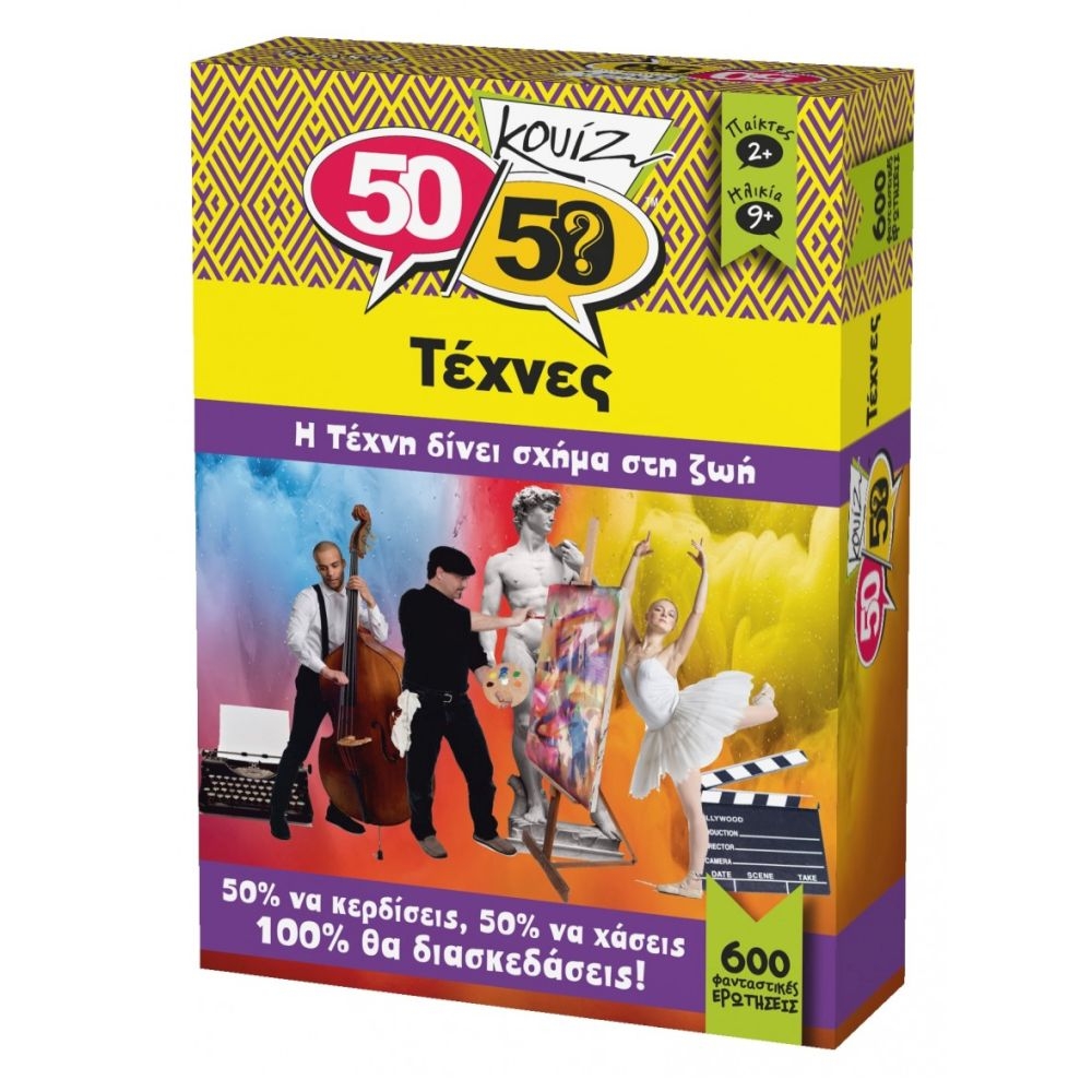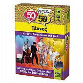 Πόσοι Έλληνες λογοτέχνες έχουν τιμηθεί με Νόμπελ; Ο Πικάσο ή ο Ντα Βίντσι ζωγράφισε τη «Μόνα Λίζα»; Τέσταρε τις γνώσεις σου και συναγωνίσου τους φίλους σου με το νέο επιτραπέζιο ερωτήσεων 50-50 Κουίζ Τέχνες! Με 600 ερωτήσεις που καλύπτουν ποικίλα θέματα, μαθαίνεις τις πιο ενδιαφέρουσες και αξιοπερίεργες πληροφορίες. Ρίξε το ζάρι και απάντησε στην ερώτηση. Αν απαντήσεις σωστά, κράτησε την κάρτα. Αν απαντήσεις λάθος, βάλε την κάρτα πίσω στη θέση της. Μάζεψε όσες περισσότερες κάρτες μπορείς και γίνε ο νικητής!