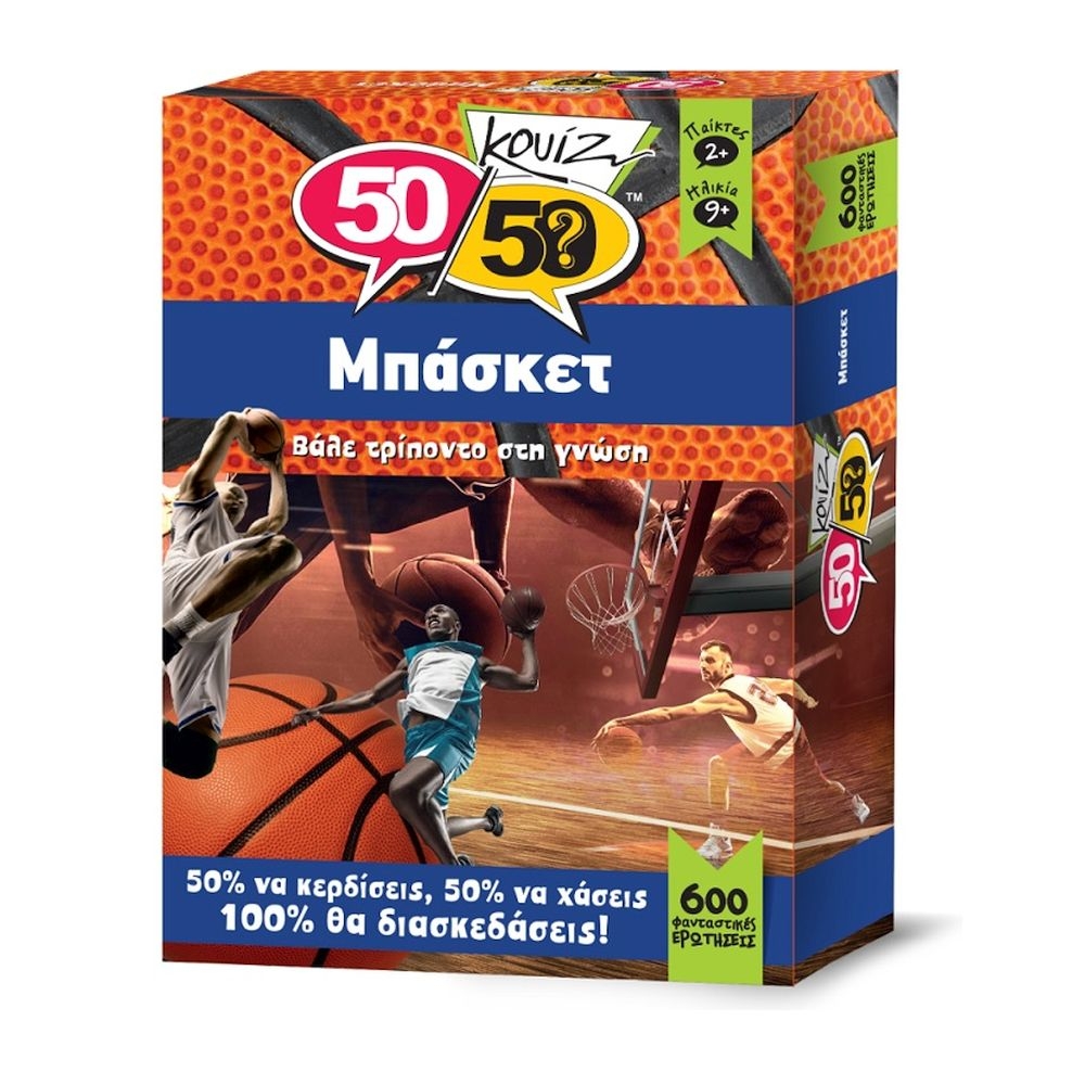 Η διεθνής ομοσπονδία μπάσκετ ονομάζεται «FIBA» ή «FIFA»; Οι Λέικερς ή οι Σέλτικς είναι ομάδα της Βοστώνης; Ο πλέι μέικερ λέγεται αλλιώς και «άσσος» ή «δυάρι»; Τέσταρε τις γνώσεις σου και συναγωνίσου τους φίλους σου με το νέο επιτραπέζιο ερωτήσεων 50-50 Κουίζ Μπάσκετ! Με 600 ερωτήσεις που καλύπτουν ποικίλα θέματα, μαθαίνεις τις πιο ενδιαφέρουσες και αξιοπερίεργες πληροφορίες. Ρίξε το ζάρι και απάντησε στην ερώτηση. Αν απαντήσεις σωστά, κράτησε την κάρτα. Αν απαντήσεις λάθος, βάλε την κάρτα πίσω στη θέση της. Μάζεψε όσες περισσότερες κάρτες μπορείς και γίνε ο νικητής!