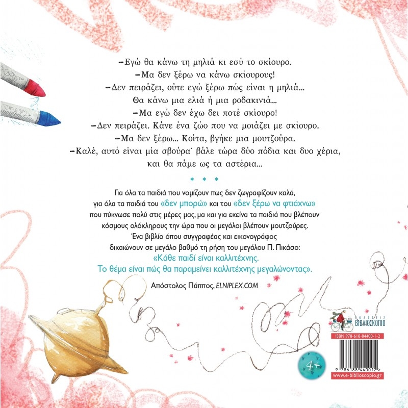 την ώρα που οι μεγάλοι βλέπουν μουντζούρες. Ένα βιβλίο όπου συγγραφέας και εικονογράφος δικαιώνουν σε μεγάλο βαθμό τη ρήση του μεγάλου Π. Πικάσο: "Κάθε παιδί είναι καλλιτέχνης. Το θέμα είναι πώς θα παραμείνει καλλιτέχνης μεγαλώνοντας"»