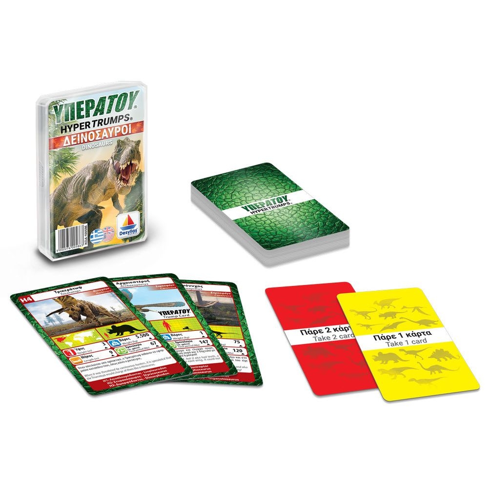 Ετοιμάσου για ένα ταξίδι στο παρελθόν, με τις καινούργιες τράπουλες «ΥΠΕΡΑΤΟΥ™». Διάλεξε χαρακτηριστικό, σύγκρινε το με του αντιπάλου, και κέρδισε την κάρτα! Χρησιμοποίησε έξυπνα την κάρτα ΥΠΕΡΑΤΟΥ και βγες μπροστά! Παίξε και μάθε τα πάντα για τους δεινόσαυρους!