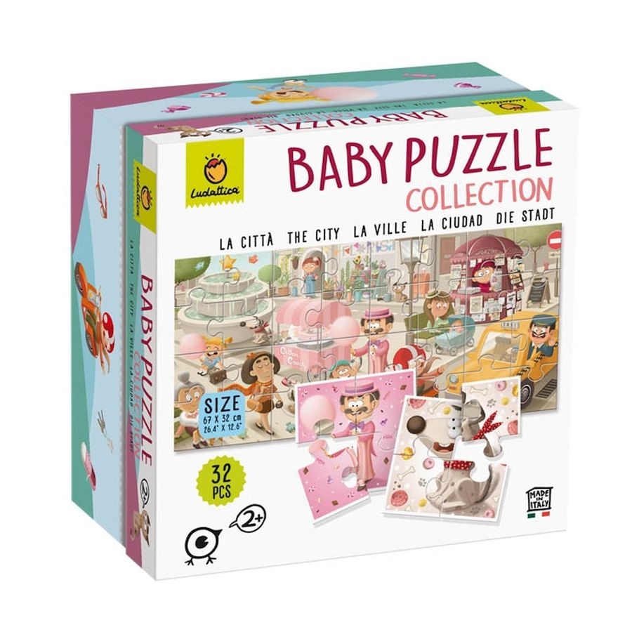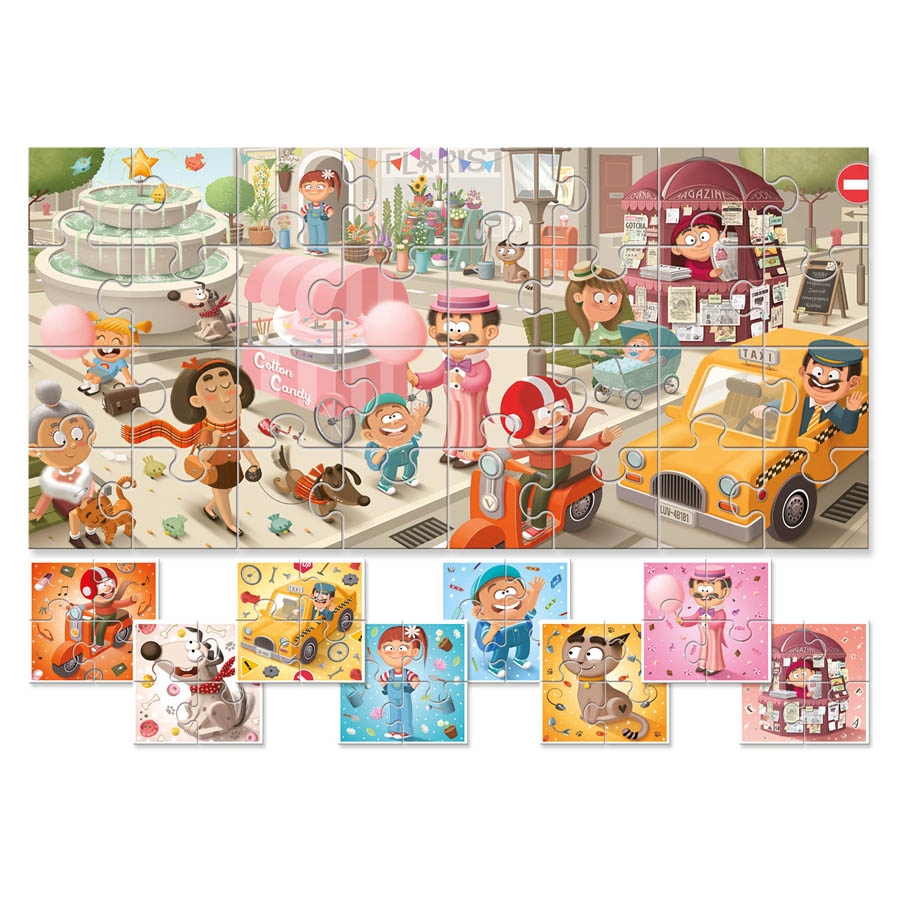 Ένα πρωτότυπο παζλ με 32 κομμάτια διπλής όψεως για τους μικρούς μας φίλους! Από την μία πλευρά, το παιδί συνθέτει 8 παζλ με χαρακτήρες της πόλης των 4 κομματιών και από την άλλη πλευρά, όλα μαζί τα κομμάτια μπορούν να συνθέσουν μια μεγάλη εικόνα 'Η Πόλη' μαθαίνοντας στο παιδί το περιβάλλον στο οποίο ζουν οι χαρακτήρες. Έτσι το παιδί μπορεί να ξεκινήσει με τα μικρότερα παζλάκια και σταδιακά να μεταβεί στην ολοκλήρωση του μεγαλυτέρου, αναπτύσσοντας τη συγκέντρωση, την παρατηρητικότητα και τη λογική!
