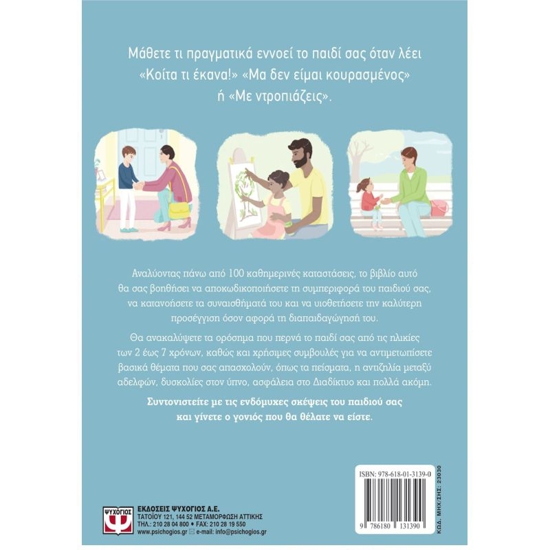 Αναλύοντας πάνω από 100 καθημερινές καταστάσεις, το βιβλίο αυτό θα σας βοηθήσει να αποκωδικοποιήσετε τη συμπεριφορά του παιδιού σας, να κατανοήσετε τα συναισθήματά του και να υιοθετήσετε την καλύτερη προσέγγιση όσον αφορά τη διαπαιδαγώγησή του. Θα ανακαλύψετε τα ορόσημα που περνά το παιδί σας από τις ηλικίες των 2 έως 7 χρόνων, καθώς και χρήσιμες συμβουλές για να αντιμετωπίσετε βασικά θέματα που σας απασχολούν, όπως τα πείσματα, η αντιζηλία μεταξύ αδελφών, δυσκολίες στον ύπνο, ασφάλεια στο Διαδίκτυο και πολλά ακόμη.