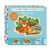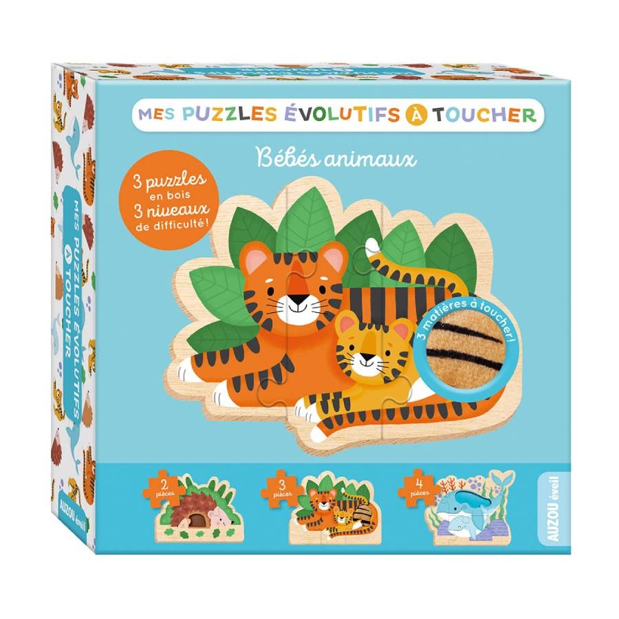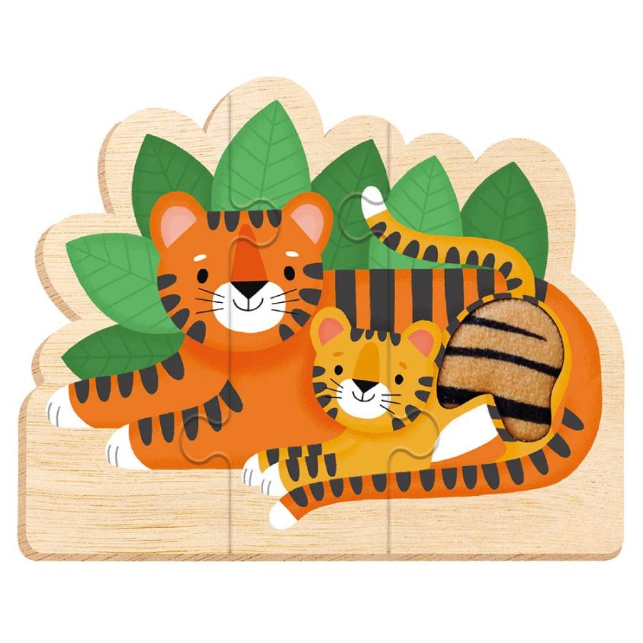 Τα πρώτα μου παζλ αφής είναι 3 υπέροχα ξύλινα παζλ 2,3 και 4 κομματιών με θέμα τα ζωάκια. Δημιουργήστε ένα παζλ 2 κομματιών με ένα σκαντζοχοιράκι να κοιμάται δίπλα στη μαμά του, ένα παζλ 3 κομματιών με ένα τιγράκι και τη μαμά τίγρη και ένα παζλ 4 κομματιών με τη μαμά φάλαινα και το μικρό της να κολυμπάνε στο βυθό. Όταν ολοκληρώσετε τα παζλ μπορείτε να ακουμπήσετε τα σημεία αφής και να μάθετε τι υφή έχει το δέρμα του κάθε ζώου.