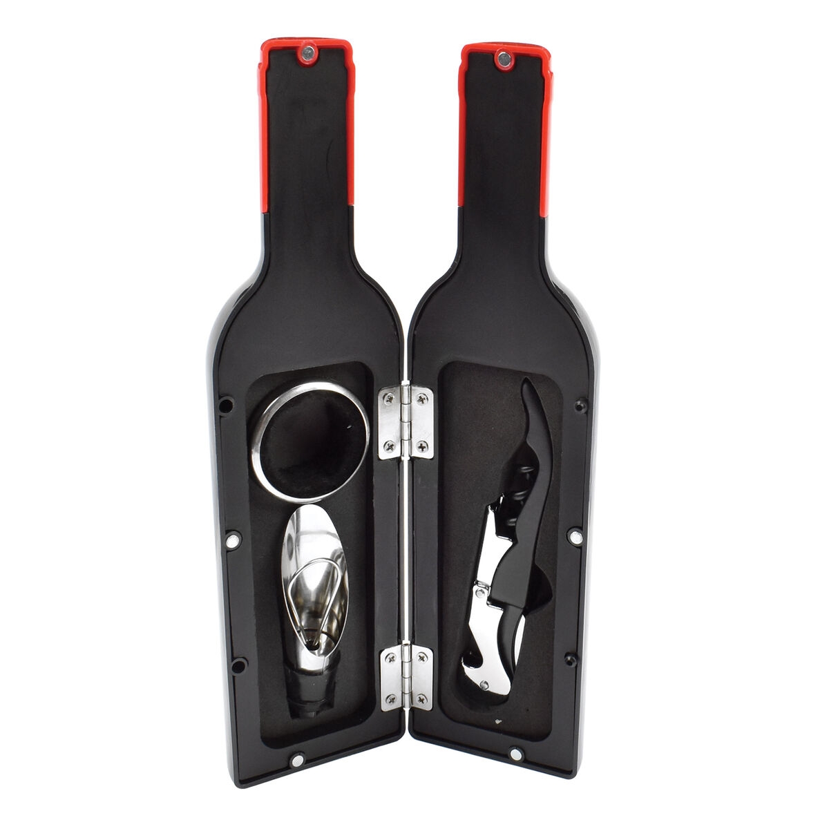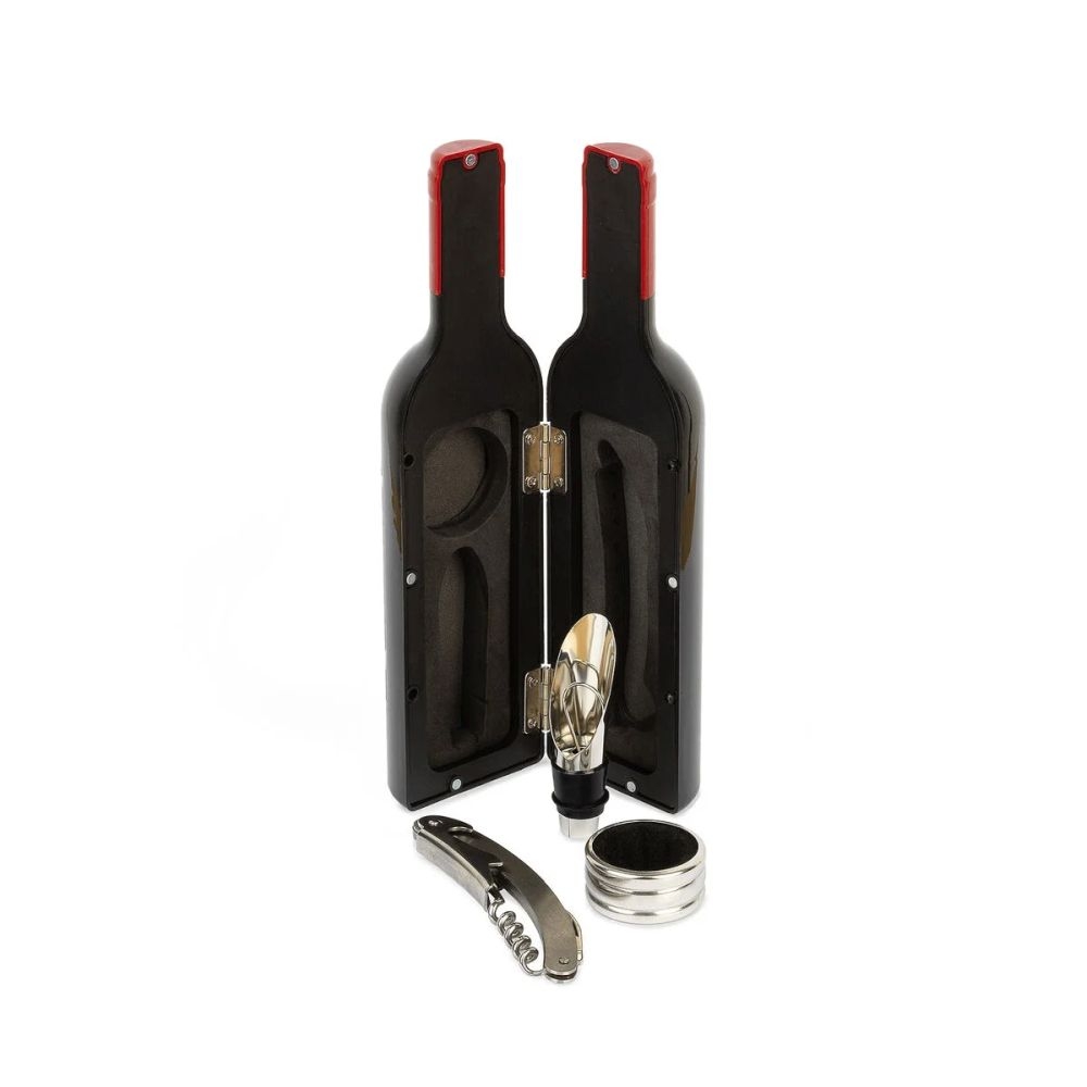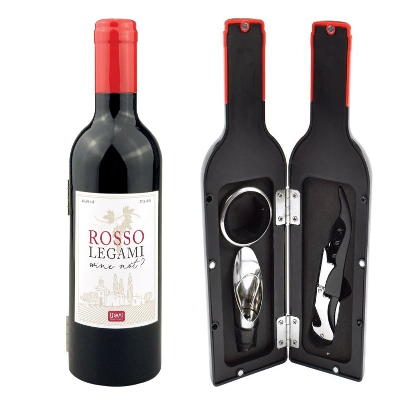 Για όσους αγαπούν το καλό κρασί ή θέλουν να εντυπωσιάσουν με μια πρωτότυπη ιδέα δώρου, το μικρό σετ κρασιού της Legami είναι μια εξαιρετική επιλογή. Αυτό το σετ αξεσουάρ σε μια θήκη σε σχήμα μπουκαλιού περιέχει όλα όσα χρειάζεστε για να χαλαρώσετε και να απολαύσετε το αγαπημένο σας μπουκάλι κρασί. Όλα τα αξεσουάρ είναι κατασκευασμένα από ανοξείδωτο ατσάλι.