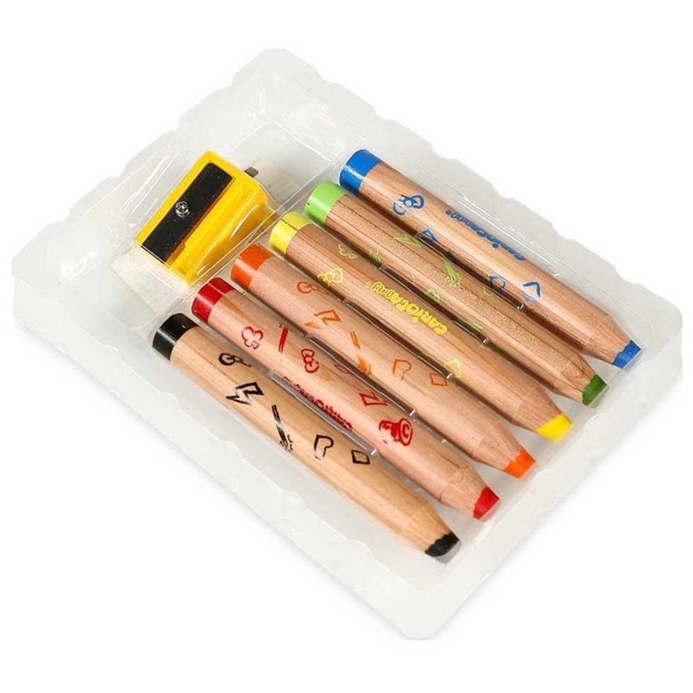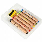 Πολύ ασφαλείς ξυλομπογιές ειδικά κατασκευασμένες για 12 μηνών και άνω. Το εργονομικό τους σχήμα σχεδιάστηκε να χωράει στα μικρά χέρια των μωρών. Με πολύ μαλακή μύτη που ξύνεται εύκολα και τους επιτρέπει να χρησιμοποιηθούν σαν κηρομπογιές ή σαν ξυλομπογιές, ακόμα και σαν νερομπογιές. Ξεπλένονται πολύ εύκολα.