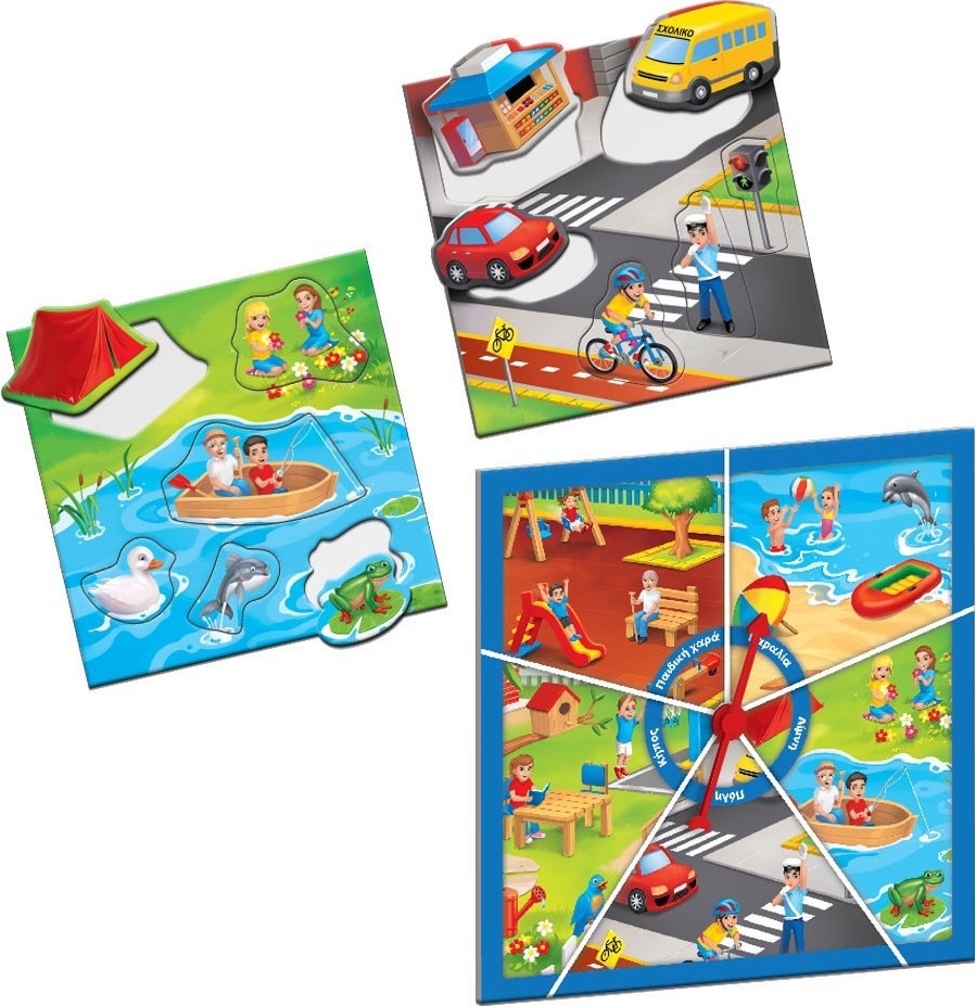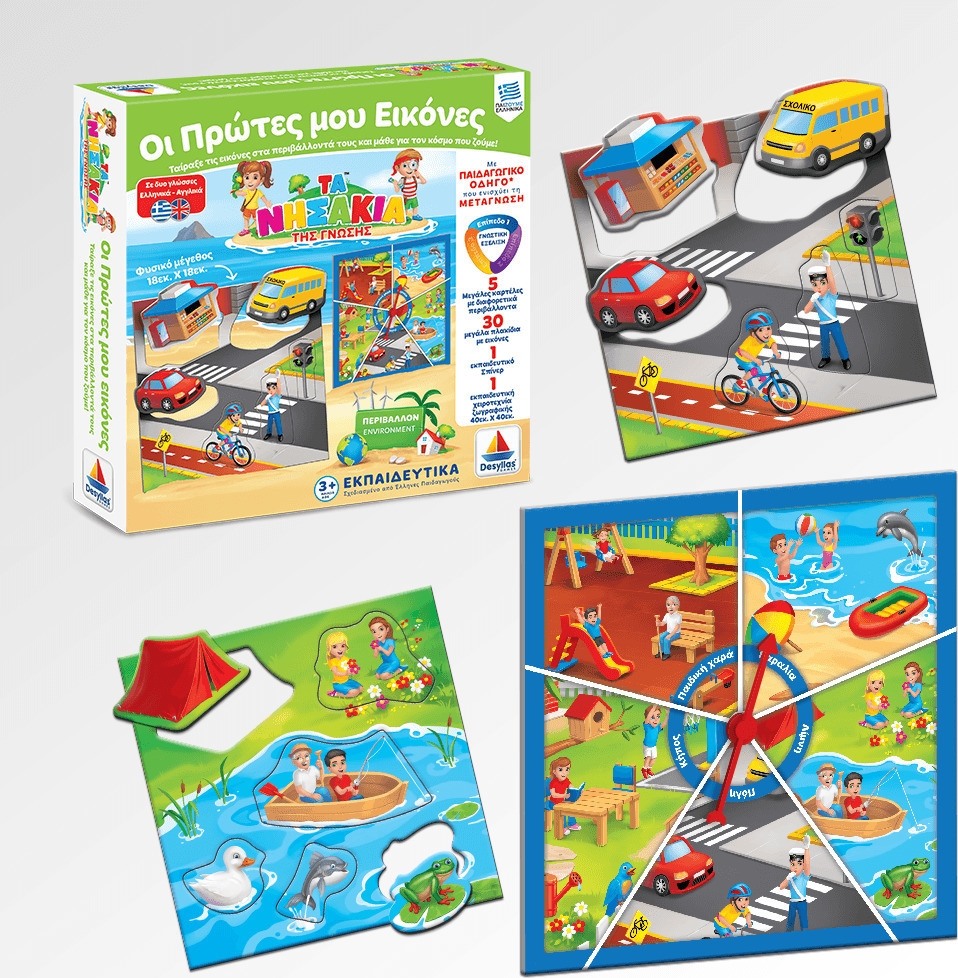 Περιλαμβάνει: 30 puzzle εικόνων, 5 μεγάλες καρτέλες με διαφορετικά περιβάλλοντα, 1 εκπαιδευτικό Σπίνερ, 1 εκπαιδευτική χειροτεχνία ζωγραφικής 40εκ. Χ 40εκ και Παιδαγωγικός Οδηγός.