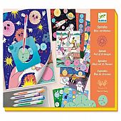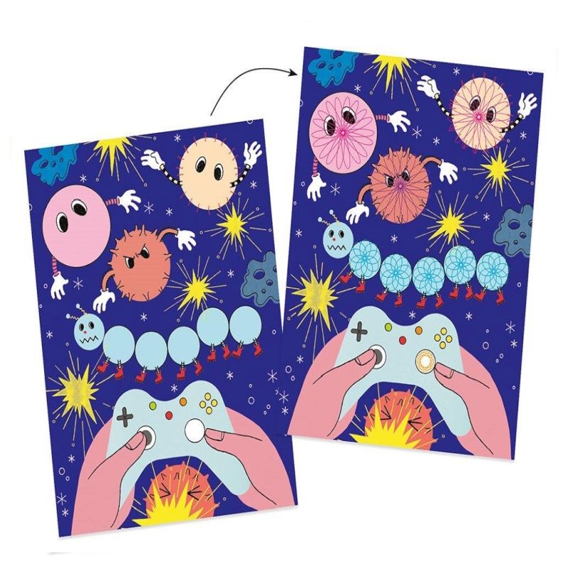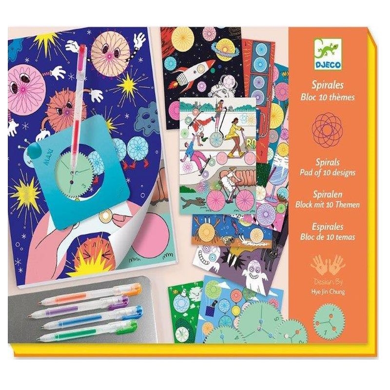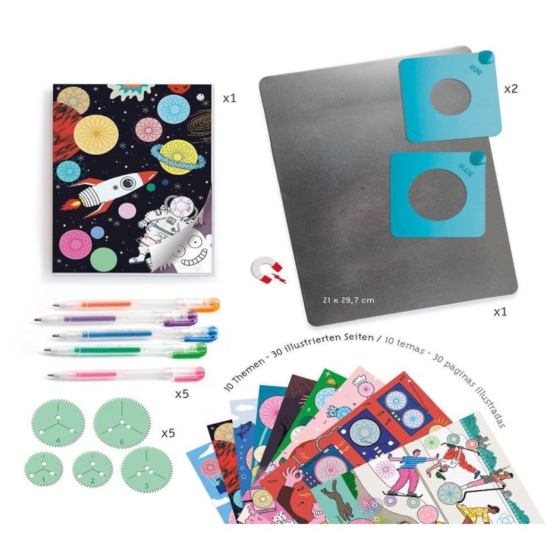 Διακοσμήστε 30 εικονογραφημένες σελίδες με σχέδια σπιράλ από τη εταιρία Djeco. Το στρογγυλό εξάρτημα έλκει μαγνητικά τον μεταλλικό πίνακα επιτρέποντας σας να ζωγραφίσετε τα σπιράλ χωρίς να μετακινείται. Αυτό σας αφήνει ελεύθερους να σχεδιάσετε και να στολίσετε την εικόνα όπως εσείς θέλετε.