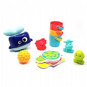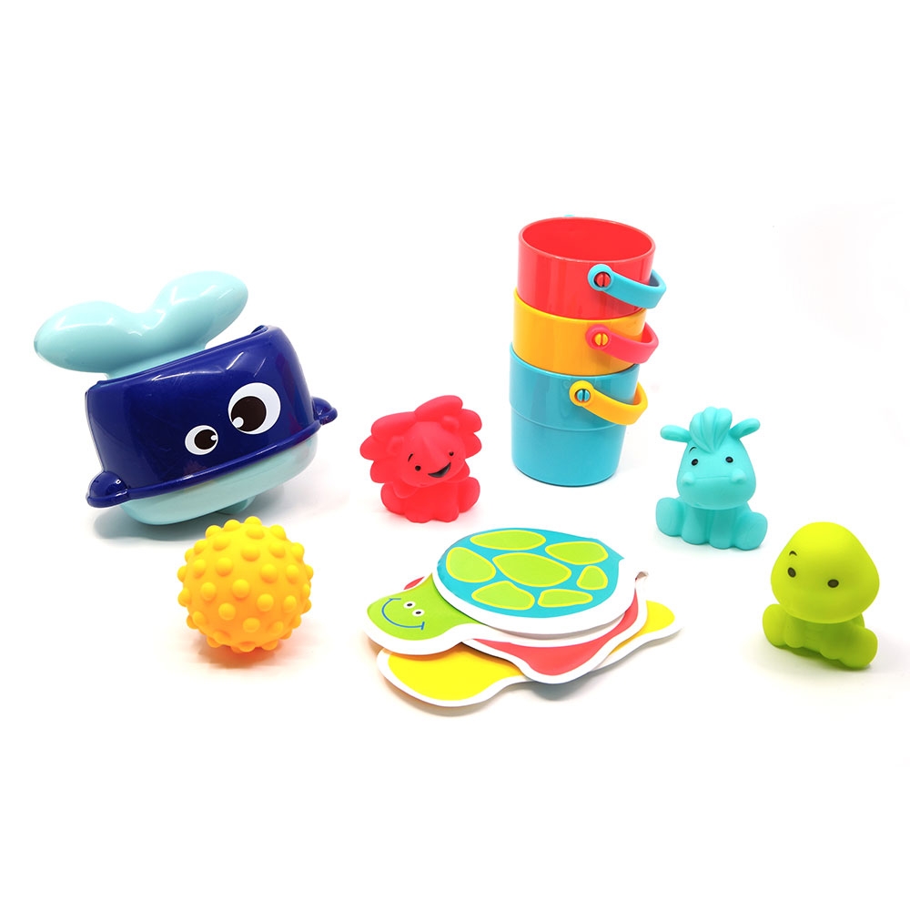 Το σετ περιλαμβάνει: 4 πολύχρωμα ζωάκια – μπουγελόφατσες, 3 κουβαδάκια, ένα βιβλιαράκι μπάνιου και μία φαλαινίτσα συντριβάνι με βεντούζα . Μετά τη χρήση αποστραγγίστε τα παιχνίδια και ξεπλύνετε τακτικά / πλύνετε με καθαρό νερό.