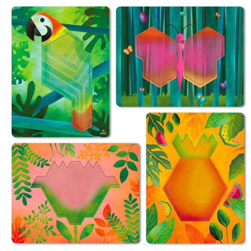 Το σετ περιλαμβάνει: 80 πολύχρωμα πλακίδια και 4 καρτέλες (παπαγάλος, λουλούδι, ανανάς και πεταλούδα).