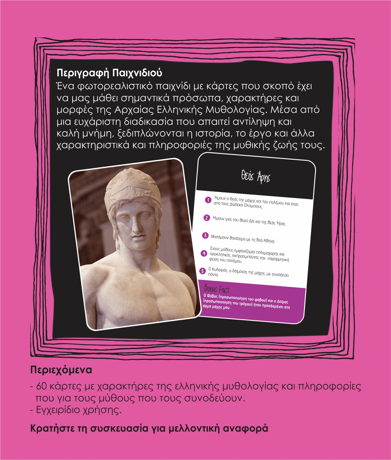 Ένα πρωτότυπο παιχνίδι με κάρτες για τη γνώση σημαντικών χαρακτήρων και μορφών της αρχαίας ελληνικής μυθολογίας.