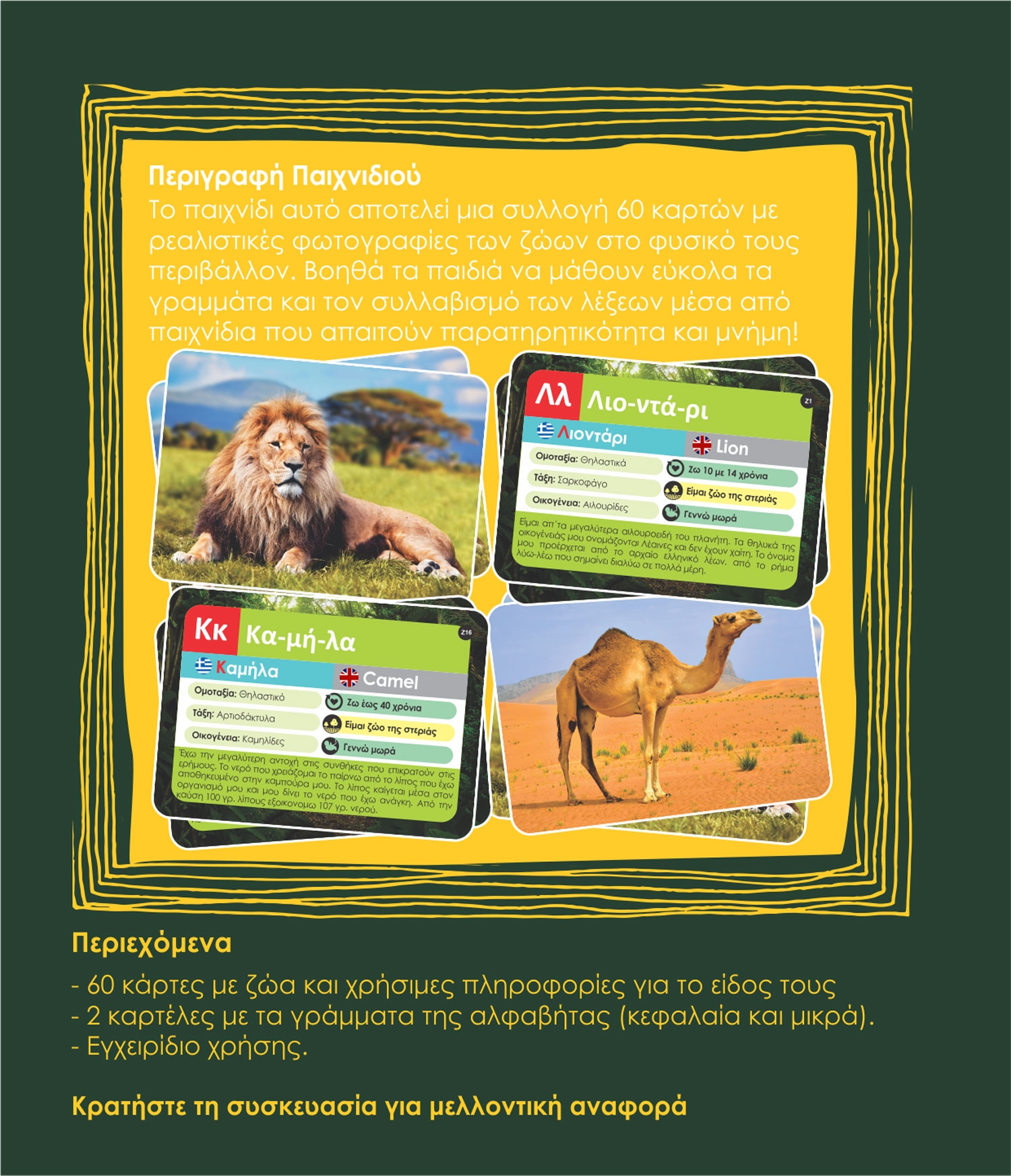 Ένα φωτορεαλιστικό παιχνίδι με κάρτες με τα ζώα φωτογραφημένα στο φυσικό τους περιβάλλον ώστε να τα παιδιά να τα μάθουν όπως πραγματικά είναι.