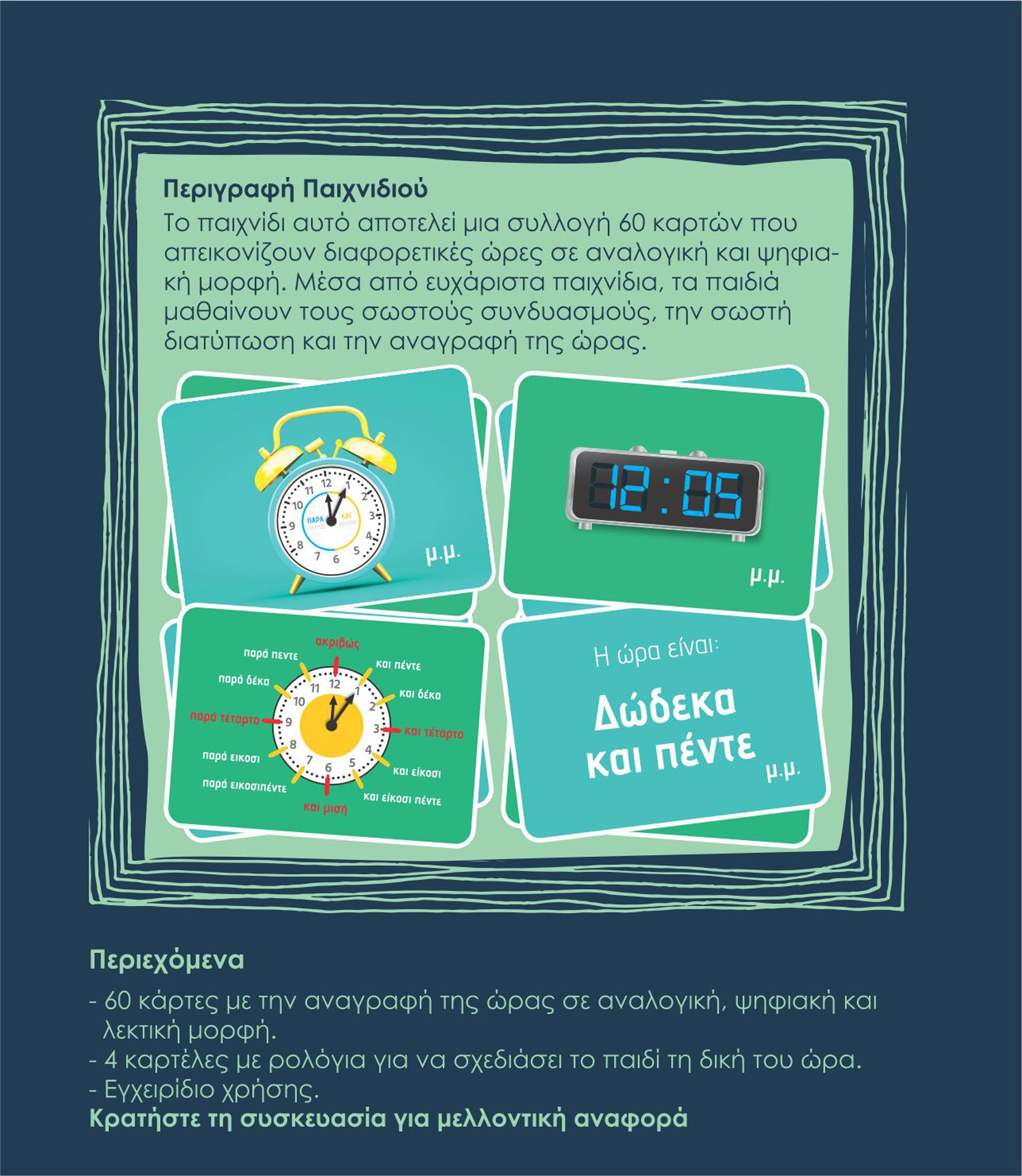 Ένα πρωτότυπο παιχνίδι με κάρτες για την εύκολη εκμάθηση της ώρας σε αναλογική και ψηφιακή μορφή.