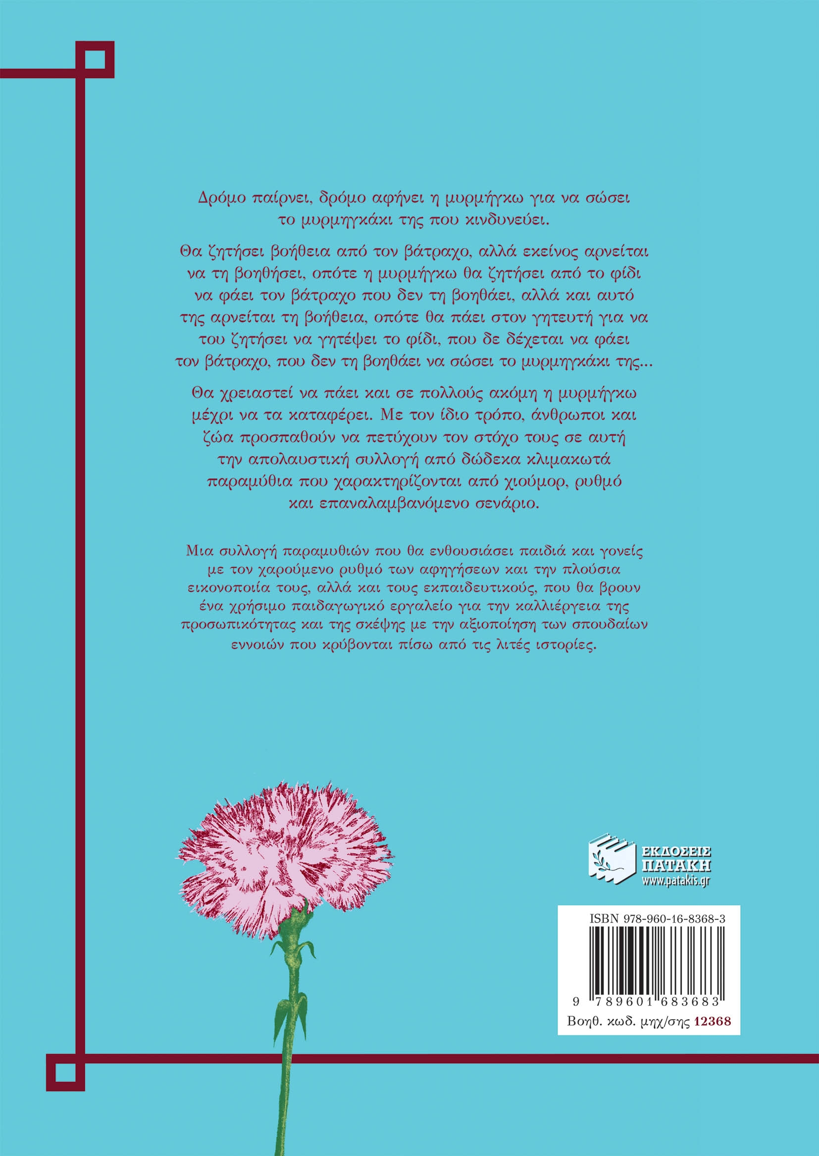 Δρόμο παίρνει, δρόμο αφήνει η μυρμήγκω για να σώσει το μυρμηγκάκι της που κινδυνεύει. Θα ζητήσει βοήθεια από τον βάτραχο, αλλά εκείνος αρνείται να τη βοηθήσει, οπότε η μυρμήγκω θα ζητήσει από το φίδι να φάει τον βάτραχο που δεν τη βοηθάει, αλλά και αυτό της αρνείται τη βοήθεια, οπότε θα πάει στον γητευτή για να του ζητήσει να γητέψει το φίδι, που δε δέχεται να φάει τον βάτραχο, που δεν τη βοηθάει να σώσει το μυρμηγκάκι της...Θα χρειαστεί να πάει και σε πολλούς ακόμη η μυρμήγκω μέχρι να τα καταφέρει. Με τον ίδιο τρόπο, άνθρωποι και ζώα προσπαθούν να πετύχουν τον στόχο τους σε αυτή την απολαυστική συλλογή από δώδεκα κλιμακωτά παραμύθια που χαρακτηρίζονται από χιούμορ, ρυθμό και επαναλαμβανόμενο σενάριο. Μια συλλογή παραμυθιών που θα ενθουσιάσει παιδιά και γονείς με τον χαρούμενο ρυθμό των αφηγήσεων και την πλούσια εικονοποιία τους, αλλά και τους εκπαιδευτικούς, που θα βρουν ένα χρήσιμο παιδαγωγικό εργαλείο για την καλλιέργεια της προσωπικότητας και της σκέψης με την αξιοποίηση των σπουδαίων εννοιών που κρύβονται πίσω από τις λιτές ιστορίες.