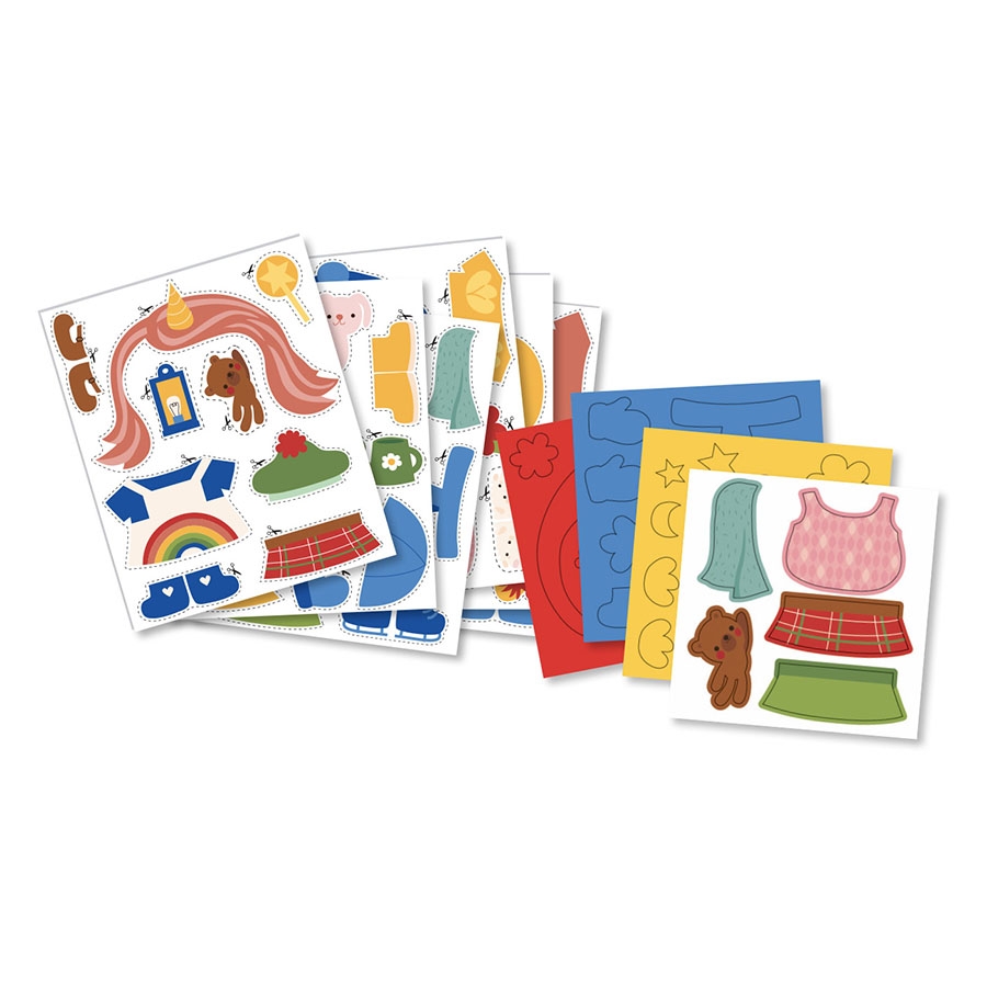 Περιλαμβάνει: 6 φιγούρες ζώων, 50 ρούχα και αξεσουάρ για να τα κόψετε και 30 αυτοκόλλητα