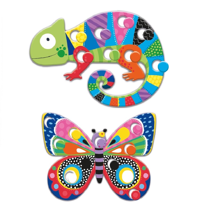 Μια πεταλούδα και ένας χαμαιλέοντας από 7 μεγάλα κομμάτια παζλ και πολλές χρωματιστές μάρκες. Ένα εκπαιδευτικό παιχνίδι για μικρά παιδιά που θα τονώσει τη λογική σκέψη, τις λεπτές κινητικές δεξιότητες, την οπτική χωρική ικανότητα αλλά και τη μνήμη.