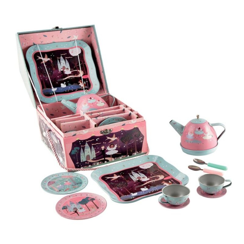 Ένα εντυπωσιακό μεταλλικό μουσικό σερβίτσιο τσαγιού σε υπέροχο βαλιτσάκι "Μαγεμένο Θέατρο". Απολαύστε το τσάι σας ή οποιοδήποτε άλλο ρόφημα, υπό τον ήχο της Λίμνης των Κύκνων, στα εικονογραφημένα φλυτζανάκια. Πρίν γεμίσετε την τσαγιέρα κουρδίστε την και απολαύστε την μουσική υπόκρουση κάθε φορά που τη σηκώνετε για να γεμίσετε τα φλυτζανάκια! Μια ξεχωριστή ιδέα δώρου!