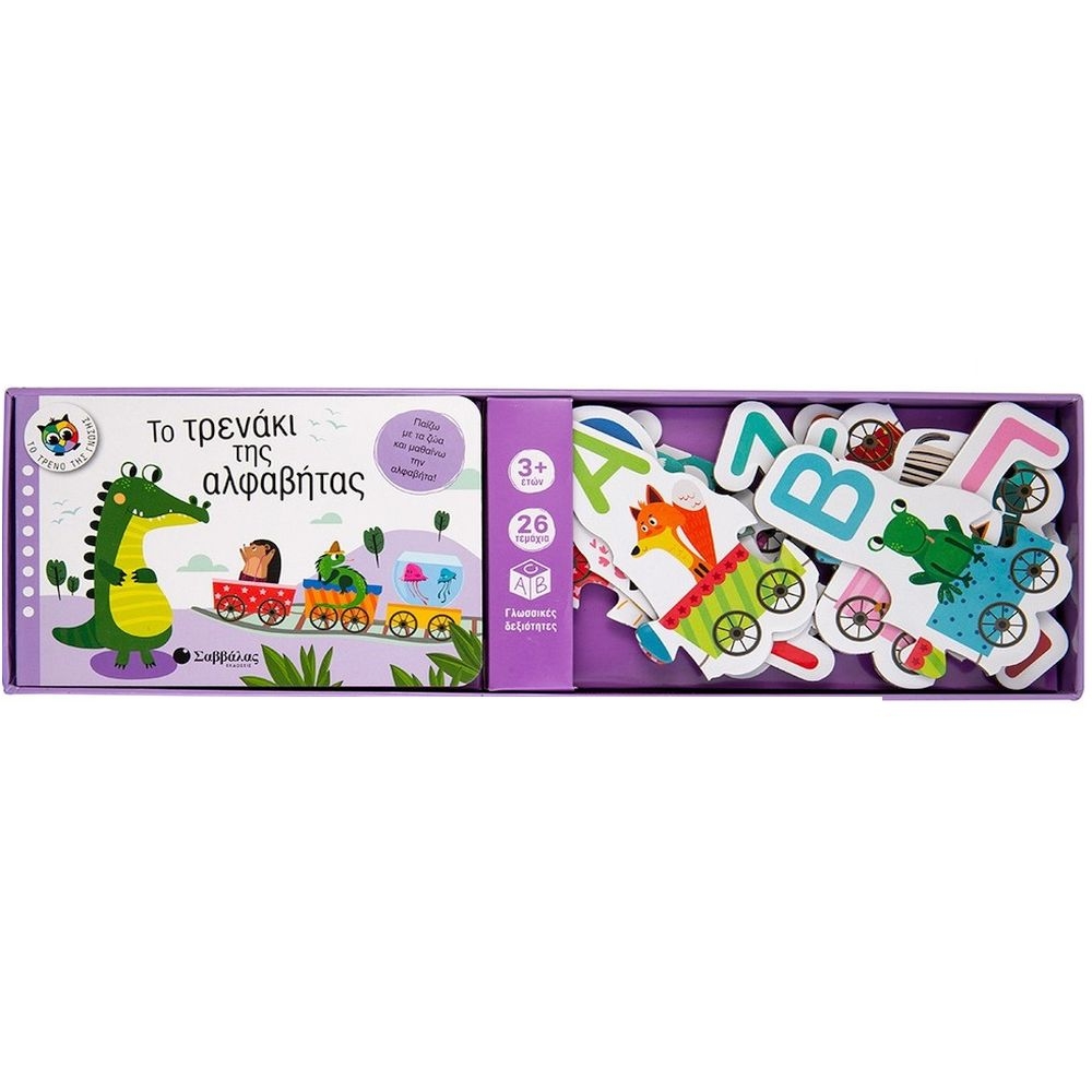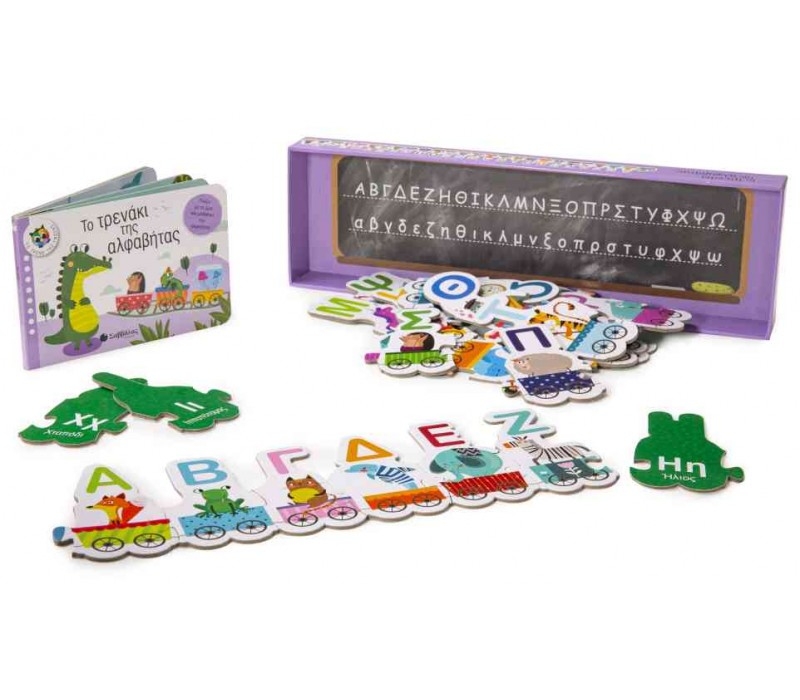 Ανέβα στο τρενάκι της αλφαβήτας και διασκέδασε μαθαίνοντας τα γράμματα! Το βιβλίο παρουσιάζει τα ζώα με το όνομά τους ανάλογα με τον τόπο όπου ζουν, ενώ στο παζλ εμφανίζονται με αλφαβητική σειρά με βάση το αρχικό τους γράμμα. Παίζοντας λοιπόν με το τρενάκι της αλφαβήτας, τα παιδία περνούν τον χρόνο τους ευχάριστα και δημιουργικά και ταυτόχρονα μαθαίνουν τα γράμματα, ώστε να μπορούν στο μέλλον να γράφουν και να διαβάζουν.