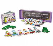 Το κουτί περιέχει: Ένα βιβλίο με τα γράμματα της αλφαβήτα, ένα παζλ με 26 κομμάτια και έναν πίνακα με όλα τα γράμματα -κεφαλαία και μικρά- της αλφαβήτας.