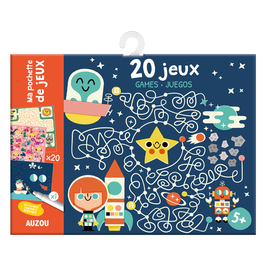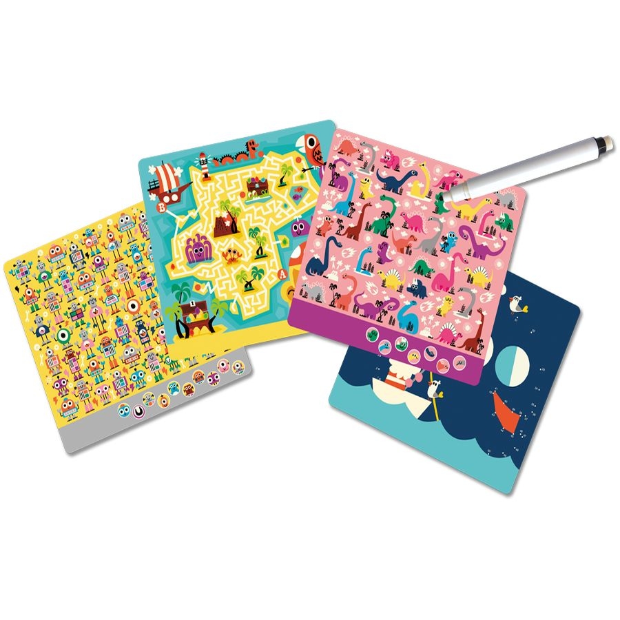 Περιλαμβάνει: 20 κάρτες με παιχνίδια, 1 μεγάλο παζλ λαβύρινθο, ένα ειδικό μαρκαδόρο με ειδική γόμα για να σβήνεις και να παίζεις ξανά και ξανά, και τις λύσεις των παιχνιδιών.