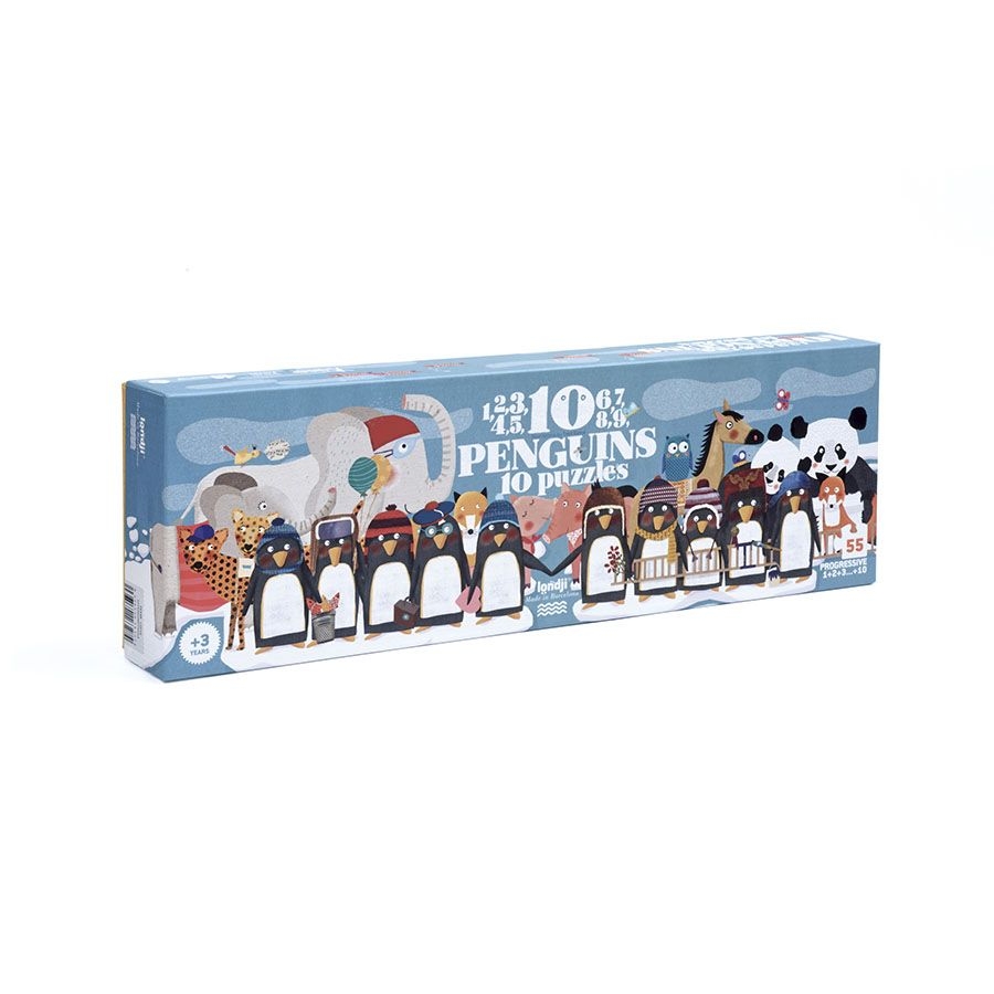 Μια κουκουβάγια, δύο κροκοδειλάκια, τρία μικρά γουρουνάκια, τέσσερα ελεφαντάκια… και στο τέλος δέκα μικρά πιγκουινάκια! Παζλ εξαιρετικής ποιότητας και εικονογράφησης, από ανακυκλωμένο χαρτί και χαρτόνι. Το κουτί περιλαμβάνει δέκα παζλ από 1 έως 10 κομμάτια, σταδιακά αυξανόμενης δυσκολίας!