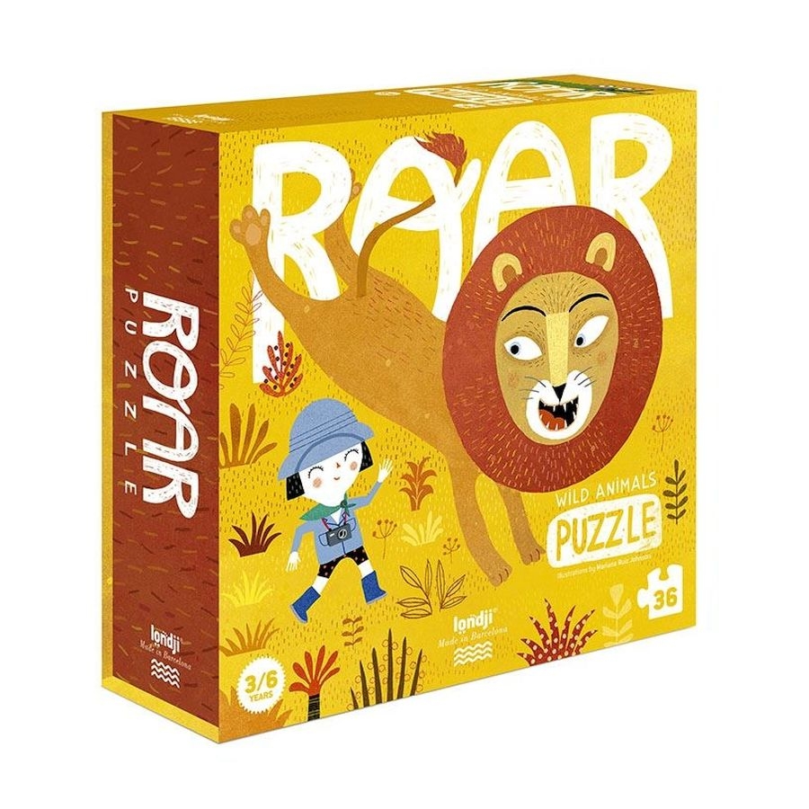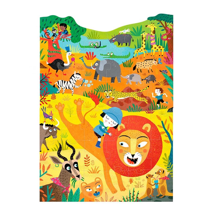 Εκπληκτικό παζλ 36 κομματιών με τη ζούγκλα και τους υπέροχους κατοίκους της. Στο κέντρο της εικόνας δεσπόζει ο βασιλιάς της ζούγκλας, ένα φιλικό λιοντάρι που βοηθά την εξερευνήτρια να ανακαλύψει τα μυστικά της. Κατασκευασμένο από 100% ανακυκλωμένα υλικά και σχεδιασμένο στην Βαρκελώνη από την ισπανική εταιρία Londji.