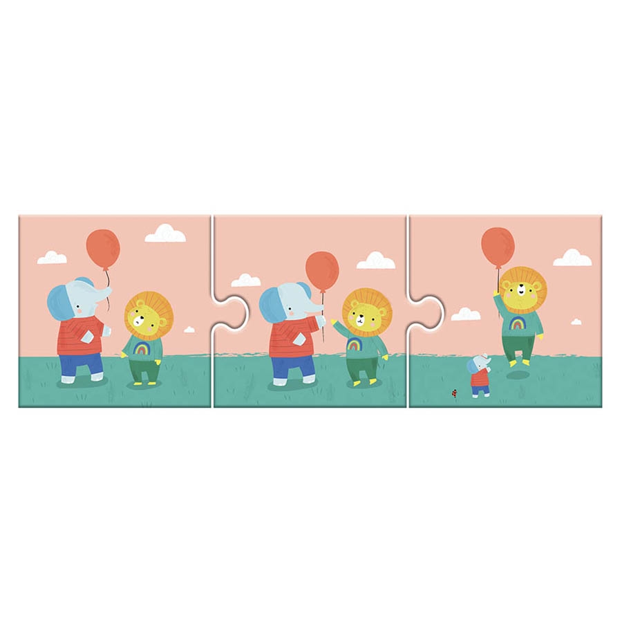 Ένα όμορφο σετ με 6 χαριτωμένα, ξύλινα παζλ των 3 κομματιών, για να αρχίσει το παιδί να εξοικειώνεται με την έννοια της χρονικότητας. Το παιχνίδι έχει σχεδιαστεί με τη συνεργασία και υποστήριξη της Sophie Lhomelet-Chapelli, έμπειρου παιδοψυχίατρου.