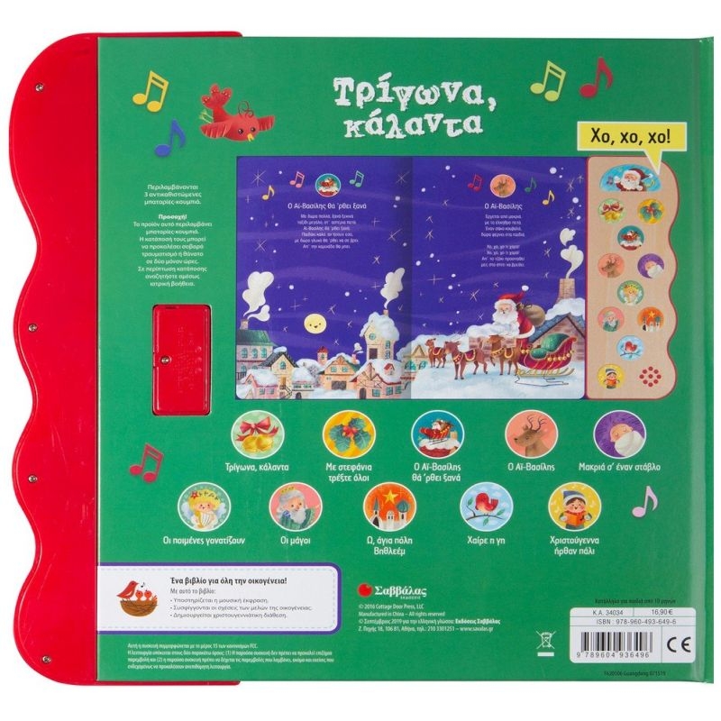 Ένα υπέροχο χριστουγεννιάτικο βιβλίο με πανέμορφη γιορτινή εικονογράφηση! Περιέχει τους στίχους και τη μουσική από 10 αγαπημένα Χριστουγεννιάτικα τραγούδια. Πατήστε το αντίστοιχο κουμπί και τραγουδήστε όλοι μαζί τα γιορτινά τραγούδια!