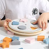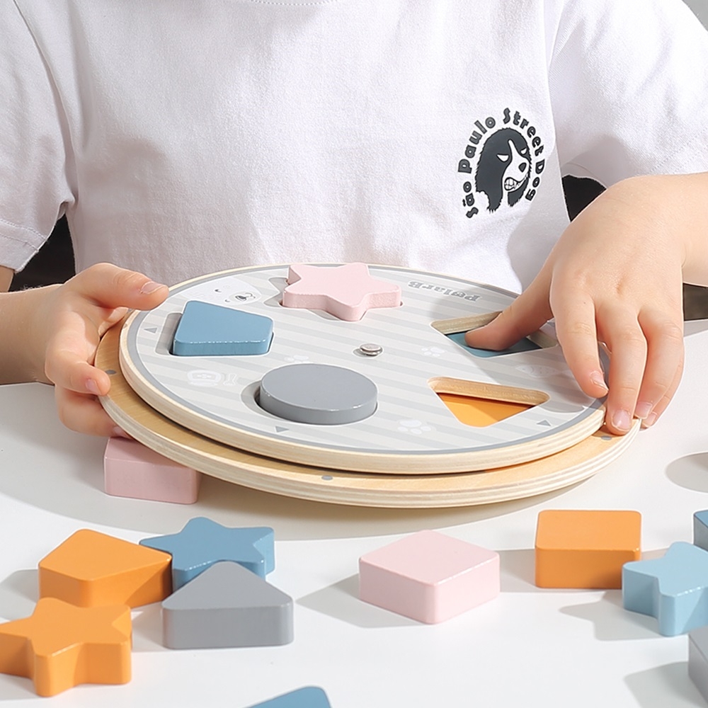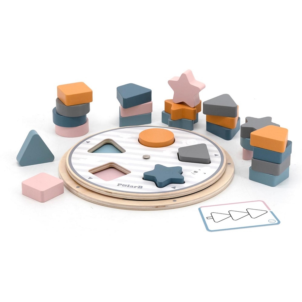 Ξύλινο παζλ σφηνωμάτων από τη σειρά PolarB της εταιρείας Viga. Κατά την περιστροφή του πάνω επιπέδου, εμφανίζονται διαφορετικά σχήματα και συνδυασμοί χρωμάτων. Το παιχνίδι είναι ιδανικό για την εκμάθηση των βασικών σχημάτων και χρωμάτων, τη βελτίωση της λεπτής κινητικότητας και του συντονισμού ματιού – χεριού.
