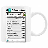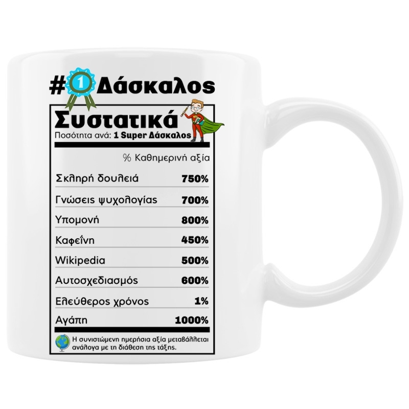 Οι δασκάλες και οι δάσκαλοι είναι οι αφανείς ηρωίδες και ήρωες της καθημερινότητας και το μυστικό της επιτυχίας τους παρέμενε άγνωστο μέχρι τώρα. Ανακαλύψαμε την πραγματική τους σύσταση μαζί με τη μυστική συνταγή από την οποία αντλούν δύναμη! Λίγο τα κατάλληλα υλικά λίγο και οι σωστές δοσολογίες, αυτό που θα δημιουργήθηκε είναι μία super ηρωίδα/ήρωας στην τάξη σας. Με αυτή την πρωτότυπη και χαριτωμένη κούπα μπορείτε κι εσείς να εκφράσετε την αναγνώριση της προσπάθειας κάθε δασκάλας/δάσκαλου για την φροντίδα και το έργο που προσφέρει καθημερινά στην αίθουσα. Αποτελεί μια εγγυημένη πρόταση δώρου για να της/του φτιάξετε τη μέρα!