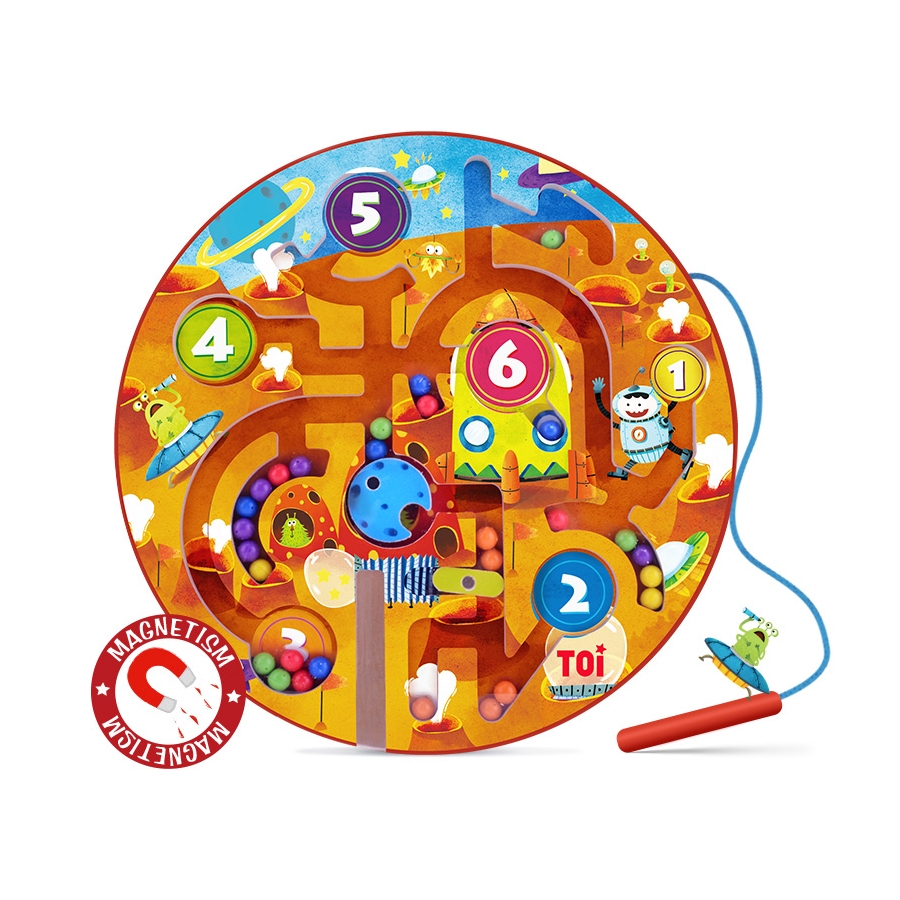 Ξύλινος, στρογγυλός λαβύρινθος με μαγνητικό στυλό το οποίο μαγνητίζει τα μικρά, πολύχρωμα μπιλάκια για να τα οδηγεί το παιδί στη διαδρομή που θέλει μέσα σε αυτόν τον πλανήτη του διαστήματος! Βοηθάει το παιδί να αναπτύξει ικανότητες όπως αυτή της συγκέντρωσης, της υπομονής και της λεπτής κινητικότητας.