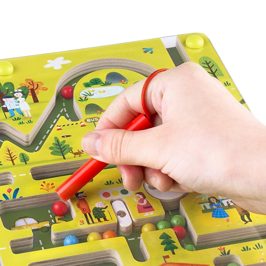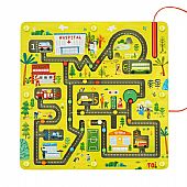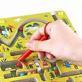 Ξύλινος, τετράγωνος λαβύρινθος με μαγνητικό στυλό το οποίο μαγνητίζει τα μικρά, πολύχρωμα μπιλάκια για να τα οδηγεί το παιδί στη διαδρομή που θέλει μέσα στην πόλη, αποφεύγοντας διάφορα εμπόδια! Βοηθάει το παιδί να αναπτύξει ικανότητες όπως αυτή της συγκέντωσης, της υπομονής και της λεπτής κινητικότητας.